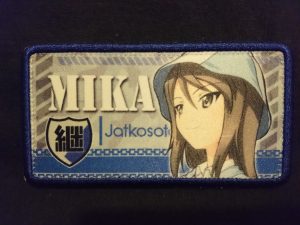 If we’re going six for six, then we can’t forget Mika of the Jatkosoka Girls’ High School. The Queen of Thief can often be found playing the Säkkijärven Polkka with the kantele she never leaves behind, when she isn’t busy borrowing equipment from other teams. This patch has a lighter color blue for the merrowed border than Miho’s patch and a wonderful combination of grays for the background. The way it depicts her portrays Mika’s refined and cryptic nature quite well and I halfway expect an unexplained proverb at any moment.
