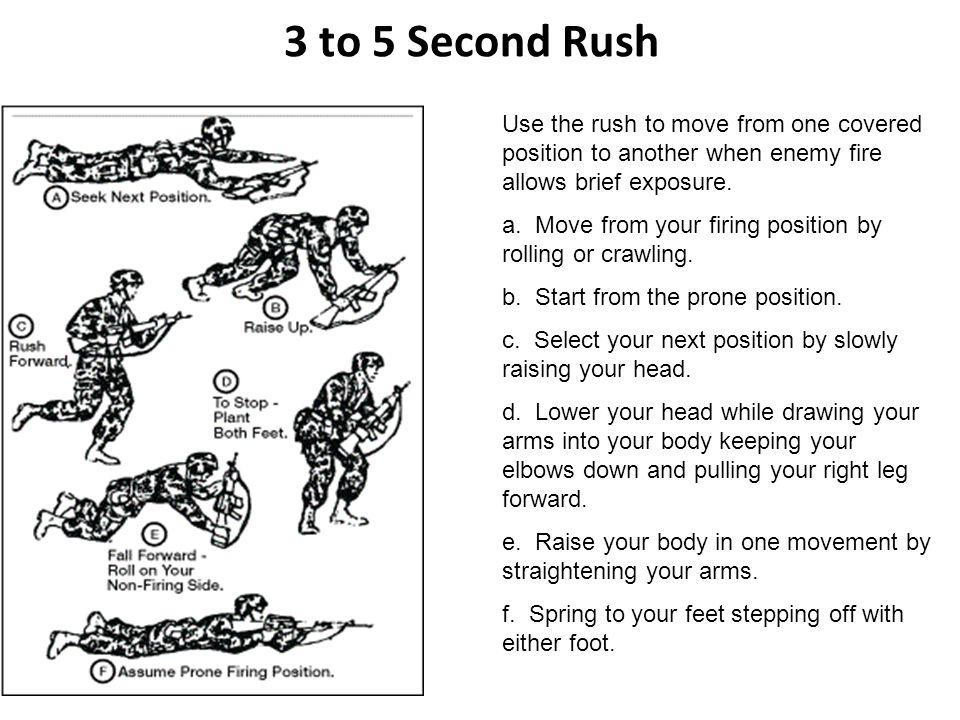 The final individual movement technique I will cover is the three-to-five second rush. Aptly named because that’s what it is, a three to five second rush to advance on enemy positions when speed is more important than concealment. Rushes should be kept closer to three seconds than five, but definitely no longer than five. The reason being that a bunch of scientists smarter than I figured out that the average time for a soldier to react, train his sights on something moving, and fire is about five seconds. Ideally you have cover available when rushing and you rush from cover to cover. If cover is not available or very sparse, what is done is you rush, immediately go prone, roll to the left or right for about one revolution, crawl for a few meters, and rush again. This is the most effective way to confuse the hell out of anyone shooting at you, and can even give the impression that they are facing a larger force than they really are. Sometimes it’s integrated with firing from the prone so as to keep the enemy’s head down and give a slightly larger margin of safety while rushing.