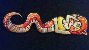 Last for our viewing pleasure is our favorite Gadsden Snek, Miia of Monster Musume fame. This is one of the coolest patch ideas I’ve seen in my past 3 years of collecting morale patches. It’s actually 3 embroidered patches measuring 2.625″ at their tallest. The tail is 2.5″ wide, the head and torso are 5″ wide, and the star of the show, the repeatable midsection, is 2.5″ wide. You can put together the tail and torso for a short patch, you can buy the set that’s 10″ wide all together, or you can string them together until you run out of space and/or money. Woodpatch also offers a wooden plaque that comes with the patch set and takes inspiration from Benjamin Franklin’s “Join or Die” for the perfect way to display your Snek.