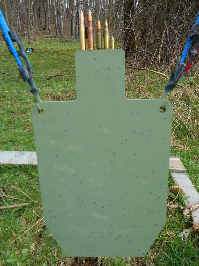 Pictured right is my steel target with cartridges placed atop of it to compare their physical size. The 8x56R is almost identical in length to the 7.62x54R. The safety of the gun is on the back of the bolt and on the left-hand side. The safety is pretty basic: flip-up the switch to turn the safety on, and flip it down to turn it off. The safety is also not a decocker, as the only way I have found to decock the gun is to pull the trigger, grab the bolt, and ride it home slowly. This can also be done in reverse to re-cock the bolt into a firing position. (Picture below in the next section gives visual aid along with the video above.)