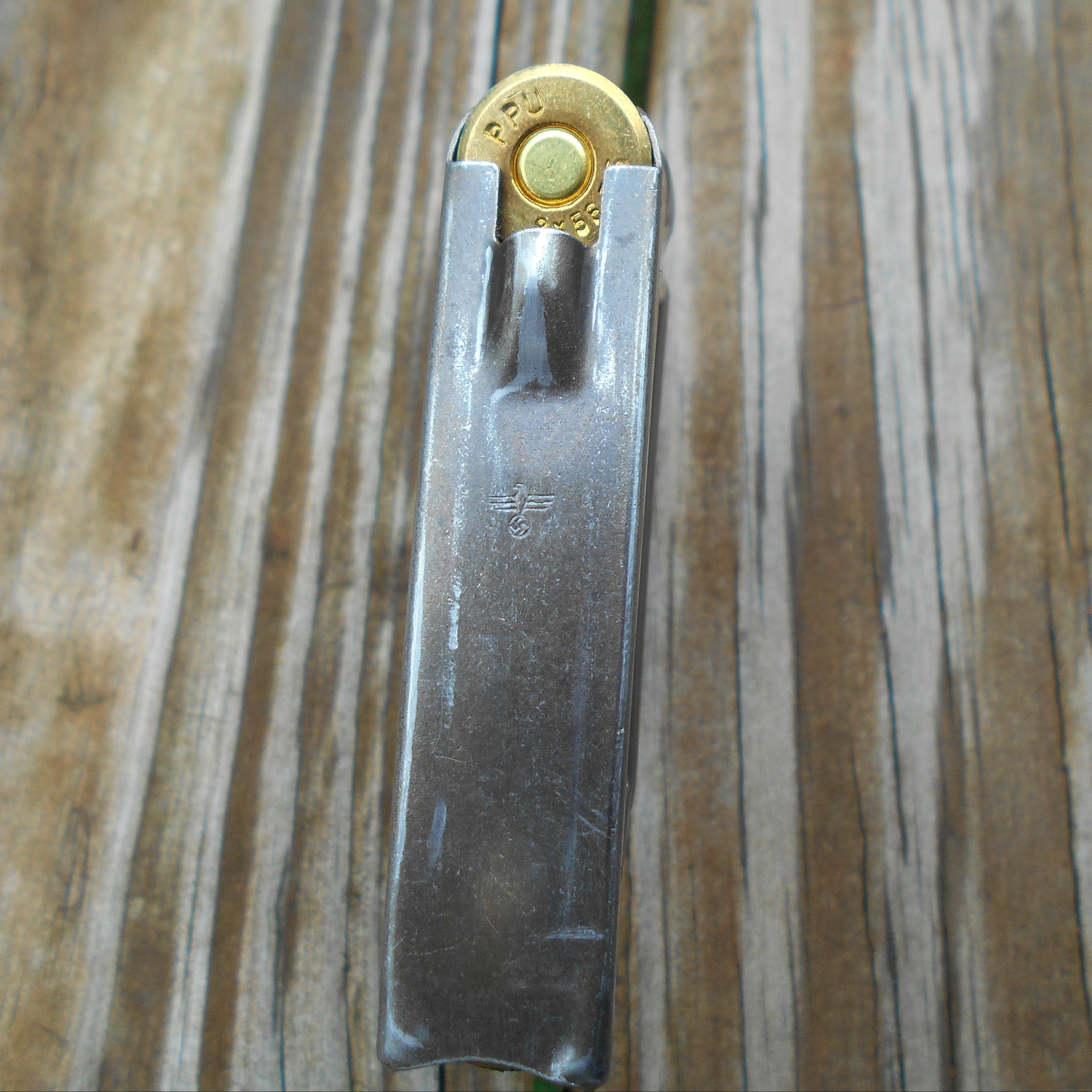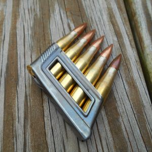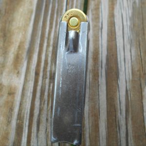 The Steyr is fed through a 5 round single stack en bloc clip. When the last round of the clip is chambered the clip drops free through the magazine well, producing a distinctive *ping* sound similar to the M1 Garand. If needed, there is a small button on the inside of the trigger guard that when pressed will eject the clip and any remaining rounds in the clip into the air allowing you to clear the gun without racking the bolt ’till empty.