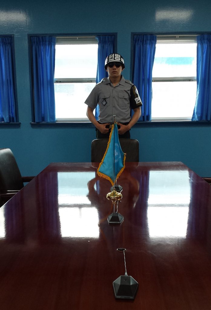 After the border was created, the North and South decided on an area where peace talks would be conducted. This area would be exactly on the border with both side’s buildings occupying the compound. South Korean/American in blue, North Korean in tan/gray. After a small PowerPoint by a few US Army personnel we were put onto buses and transported through some woods to the compound. No pictures were allowed along the way. Once we arrived at the compound, we were told to form two columns on stairs immediately outside of the JSA. After it was explained to us we were not to take pictures of the North Korean observation building to our right upon entry, we were asked if we had any questions. The tour group column on our left was a US Marine group and, I am not shitting you, the guy beside me asked “Hey, ya’ll got any crayons up there? I’m starving.” I don’t think I’ve ever tried any harder in my life to stifle laughter.