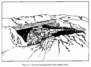 Finally, we need to cover developing a defensive position that will be in use for extended amounts of time. Lets say the patrol base needs to be made into a FOB. Guess what: you better get digging. Defensive preparations need to bear in mind that they need to offer protection from not only direct and indirect weapons, but aerial platforms and mitigate any openings a raid party can sneak in through. By digging a hole about as deep as the average M4 (or AR15 for you civilian plebs), and about 7 feet long, you enable a pretty decent fighting position where you can sleep and store your gear. Supplement that with sandbag emplacements around it, and you might even have enough room to sit up for a bit. Make sure to slope the immediate front of your hole so as to have a grenade sump and mitigate any incoming frags from rolling into your hole. Following basic foxholes, build overhead cover using sandbags and logs, so as to protect from airburst munitions and shrapnel. Set up claymores ahead of your position far enough so you don’t get any shrapnel but close enough you can observe them. Build ditches around the area and set up concertina wire in the ditch so as to stop vehicles from trying to enter and preventing enemy infantry from using the ditch for cover.