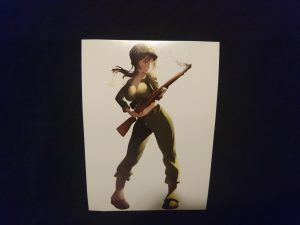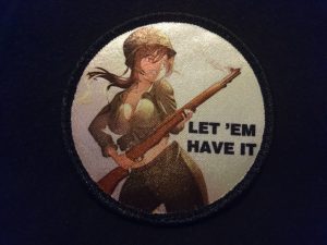 Next on the list for giving away is a portrait print of the same lovely American lassie on the patch. She wields, in the words of General Patton, “The greatest battle implement ever devised.” While we may have since surpassed the technology and design, that magnificent weapon still gets a rise out of all of use when the en-bloc clip goes, “PING!” This print, like the other featured print, is 8.25″ tall by 6″ wide and features a nicely shiny gloss finish. It’s for sale but wouldn’t you rather get a chance to win this fine print?