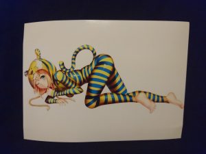 Starting up the show today is a print that is not available on the website. That’s right, you can’t buy it, you have to win it! This lovely glossy print measures in at a massive 8.25″ wide by 6 inches tall and features Kawaii Patches’ tiger girl. It plays off the WWII slogan “en Svensk Tiger,” meaning the “Swedish Tiger,” or “a Swede keeps silent,” similar to the familiar American saying, “Loose Lips Sink Ships.” This would be great for putting in a frame and displaying on your bookshelf only to hide it when family visited.