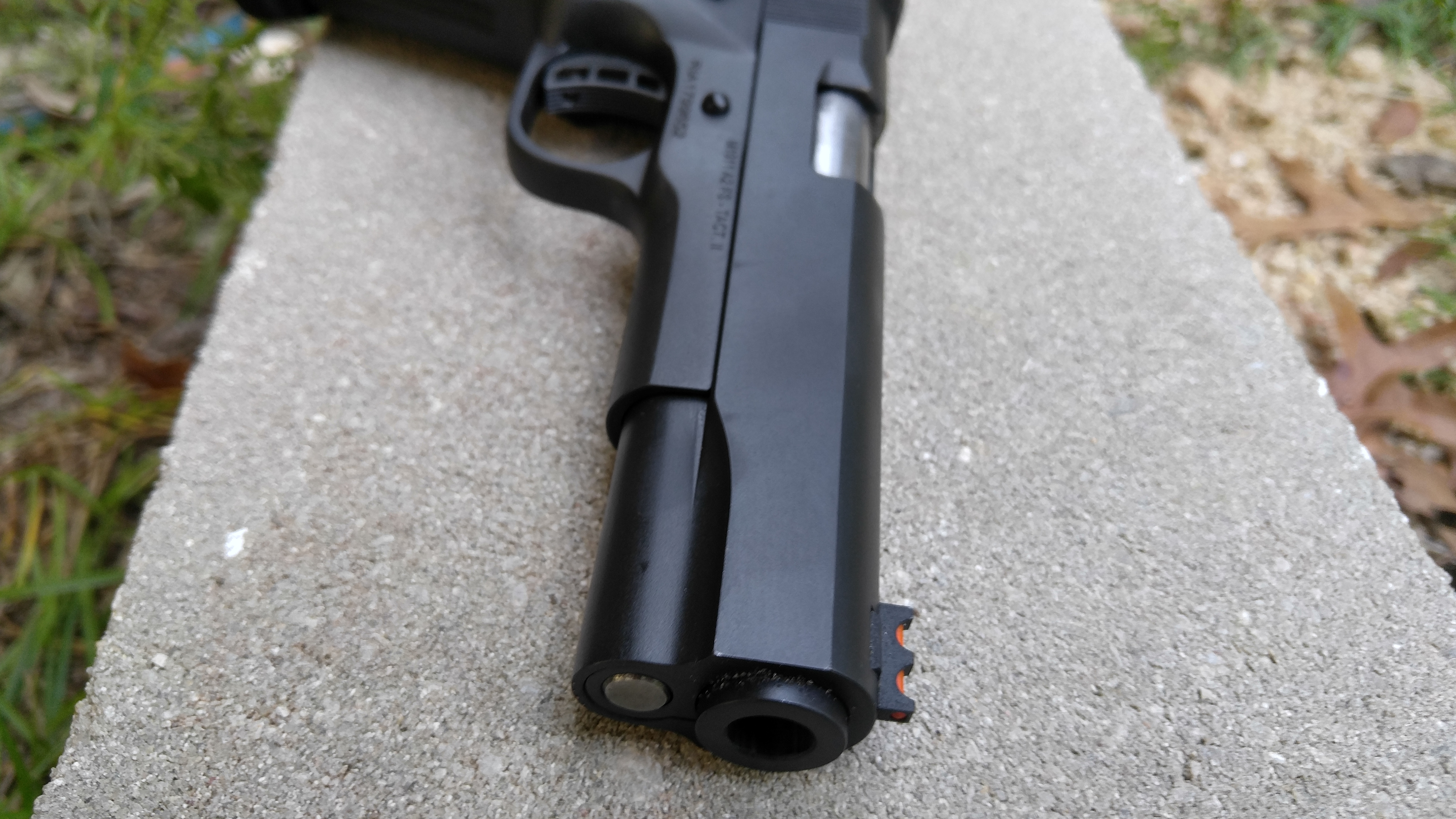 Accuracy is top notch thanks to the bull barrel and tight configuration. In terms of mechanical accuracy, half is the trigger, a quarter is the barrel and sights. The trigger is about four and a half pounds and breaks nice and clean. The trigger itself has always been one of the high points to any 1911 style pistol.