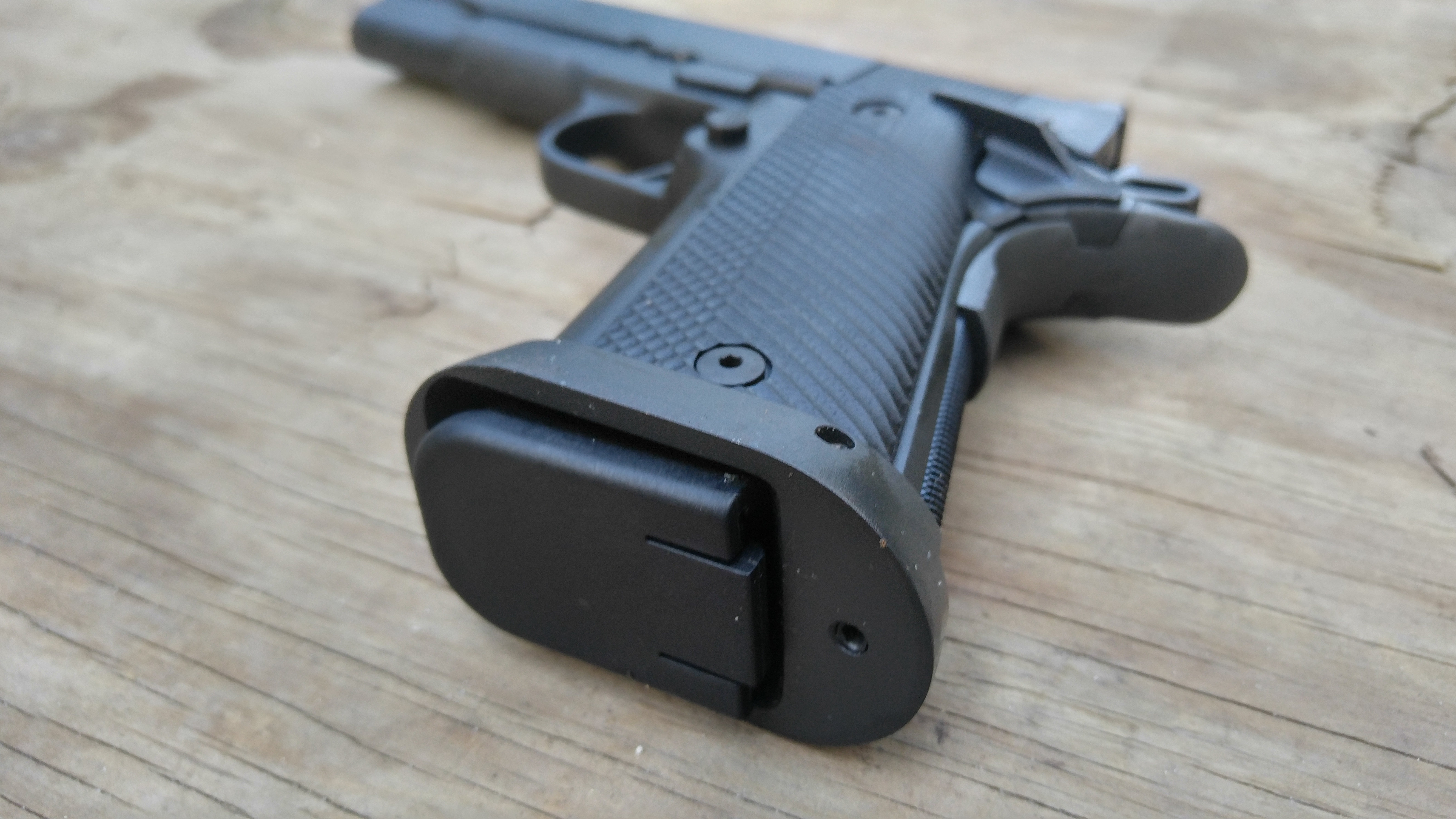 This makes it a heavy lady; the thing already comes in at 3 pounds unloaded. It’s also a fat bottom girl. The grip is wide, even for my XXL hands, and the addition of a flared magwell makes it a literal handful. And on that topic on my first day with the gun I found it pretty easy to pinch the skin on the index finger of my offhand trying to do reloads. That being said, reloading is easy, and the flared magwell makes it so the mags flow right into the gun.