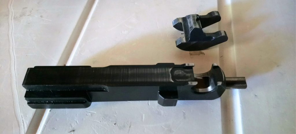 Removing the BCG from the weapon is easy too. As long as you remember to put the charging handle in the “field strip” position, push a pin and pull it out all the way backward like for an AK.