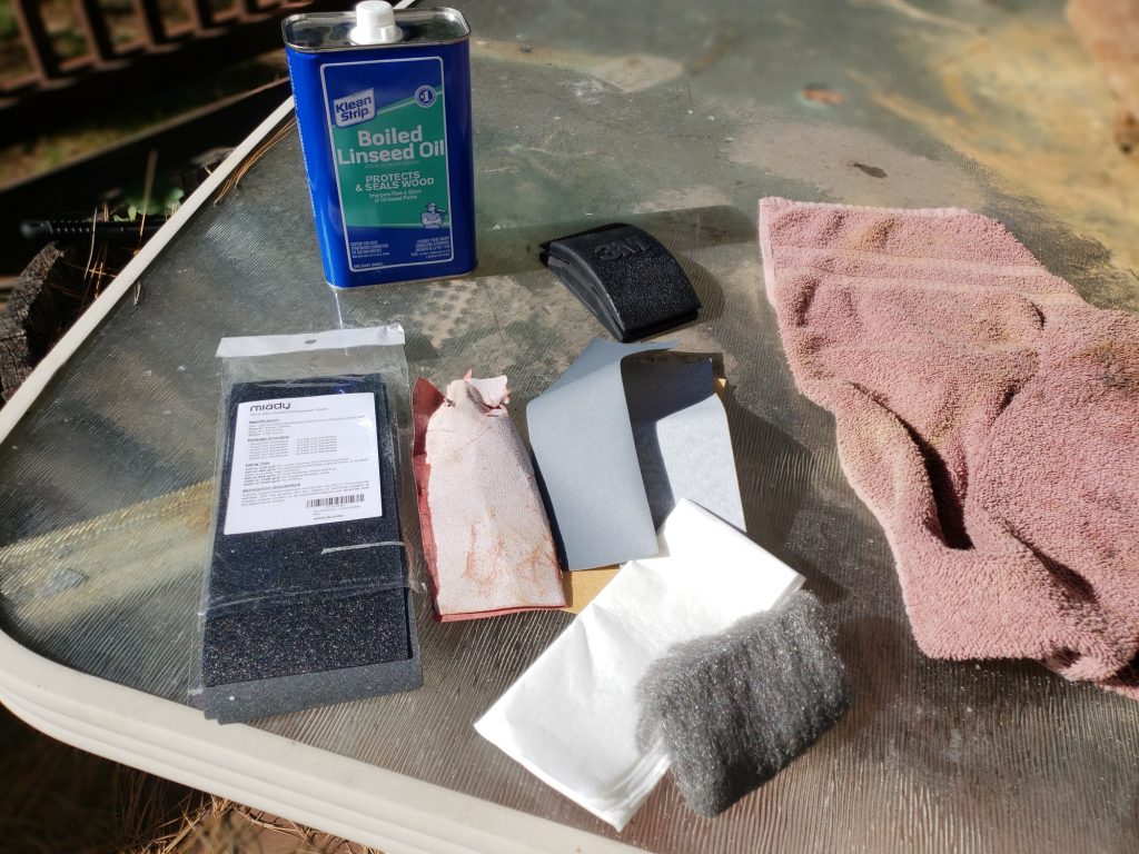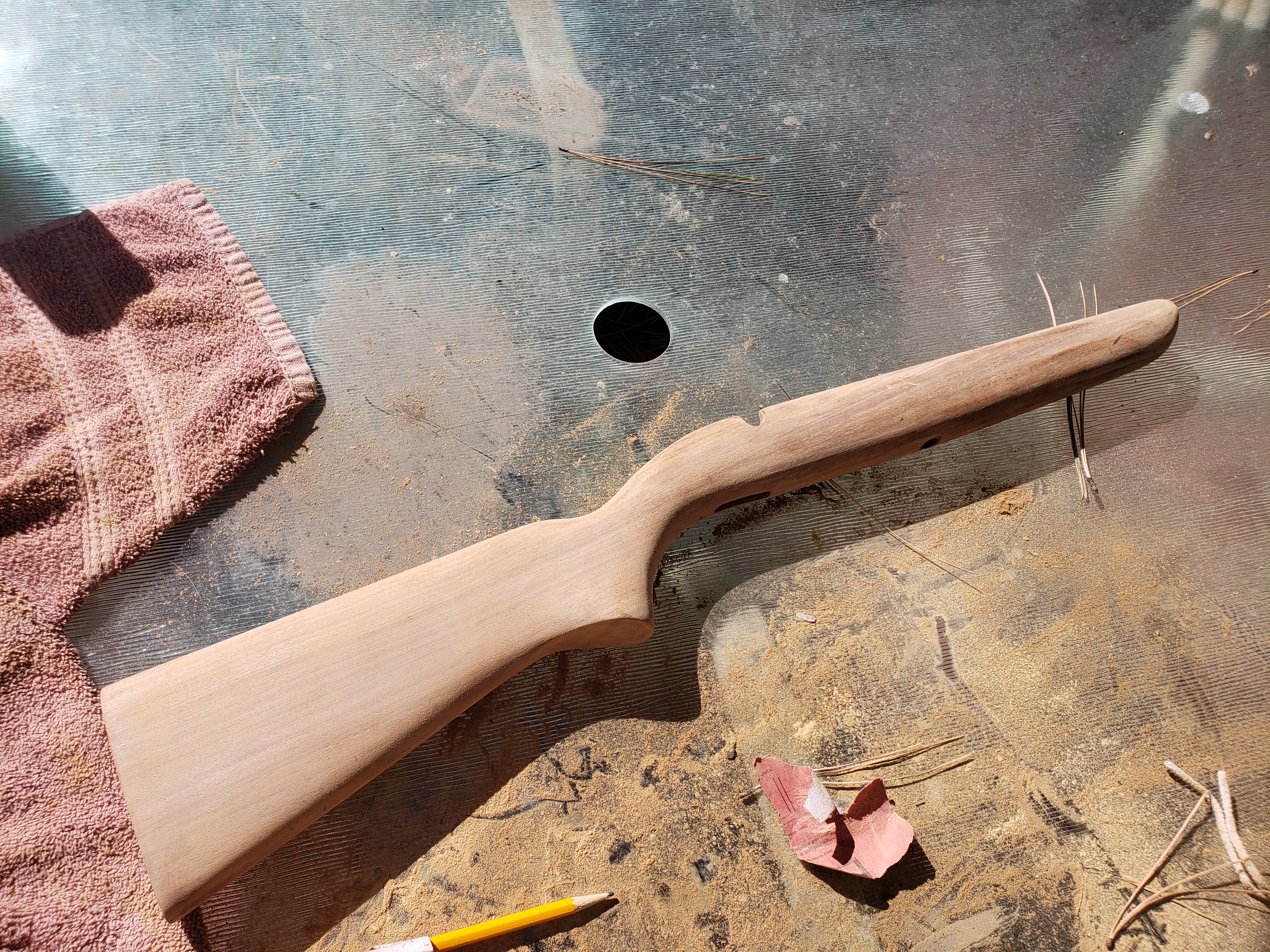 100 grit sandpaper was used to remove all of the old finish by hand. For hard to reach areas like the bolt channel, sandpaper wrapped around a wooden dowel was used. Once all of the old finish was removed 220 grit sandpaper, then 280 grit sandpaper, then 320 grit sandpaper was used. After that steel wool was used to polish the bare wood stock. From there a dry, lint-free cloth was used to clean the sawdust from the stock before a finish was added.