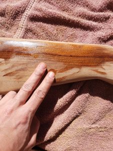 Boiled linseed oil is used to restore and finish this stock, as it is often used for many firearms built in this time period. For this rifle staining would be unnecessary, and the boiled linseed oil can bring out the natural luster of the wood in a simple, yet elegant manner. A small amount of oil is applied and hand-rubbed with several thin and uniform layers into the stock, allowing oil to soak into the wood and dry before more layers are added.