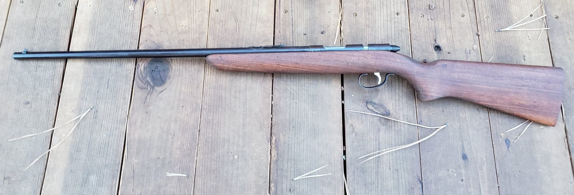 This Remington 510 Targetmaster Single Shot 22 caliber rifle was acquired very inexpensively and would be a good candidate for repair and restoration. However, it is in very rough, albeit functional condition. The action and barrel show very light surface rust above the stock. The bluing is worn into the bare metal externally and would easily be affected by corrosion if not oiled frequently. The stock, while crack free, shows severe wear on the finish with the polyurethane finish bubbling up and appearing to be melting in an ugly manner. The buttplate is damaged and needs replacement.