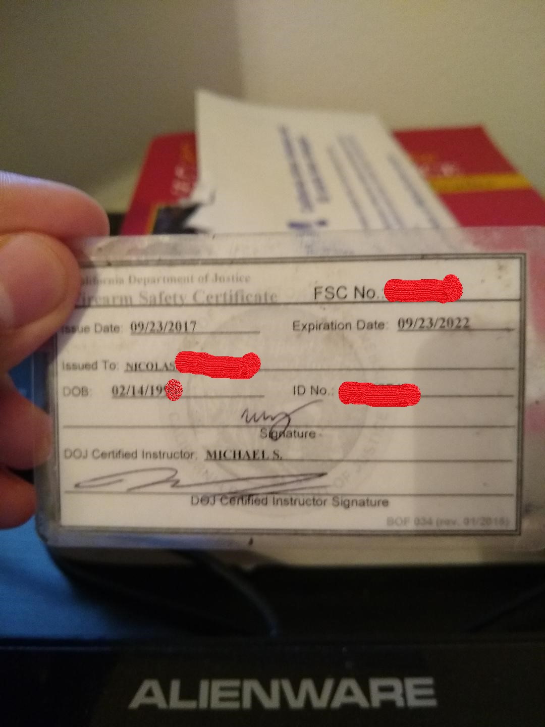 In the state of California, in order to purchase a firearm, you must obtain a Firearm safety certificate (Will refer to as FSC from now on) by passing a 25 question multiple choice test on gun safety, and paying a 25$ fee to the California DOJ, This is what it looks like: