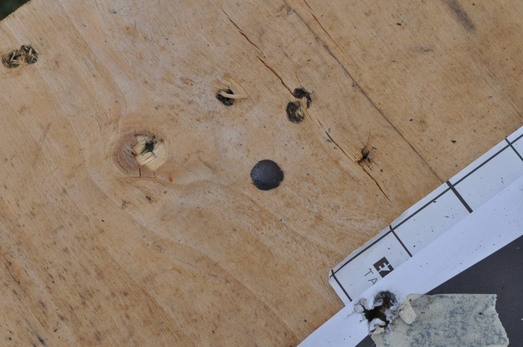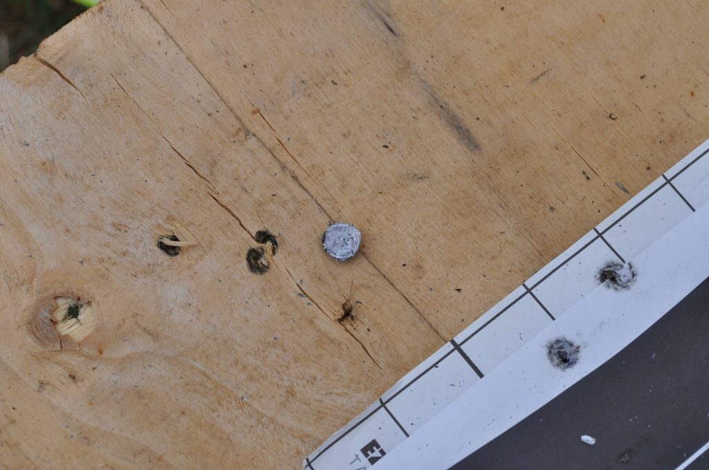 As expected M855 didn’t make it through the ¾ inch plate either. It seems to have similar jacket transfer as M193 with a slightly deeper and wider crater.