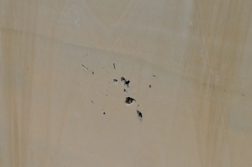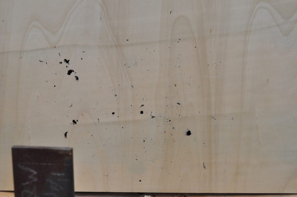 M193 got through the ¼ inch plate with no problem too. I was a little to the left with this shot but not far enough off to skew results. Jacket transfer is present here as well however there is notably less of it occurring and the mushrooming effect is lessened as well. Additionally, the walls of the bore itself appears to be rougher than the 1/8th inch plate and the amount of disturbed material on the rear face has increased. There also appears to be a sharp increase in spalling that appears on the back board as seen in the additional picture A view of the exit hole. Notice how the amount of disturbed material appears to be greater than the 1/8th inch plate 15 A better view of the front face. Notice the decreased mushrooming effect and the rougher bore. A view of the spalling. A considerably larger amount has been created from this single shot than the previous two combined.