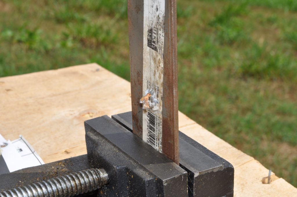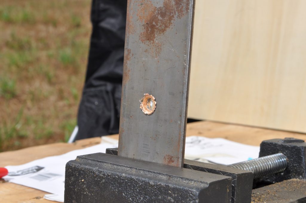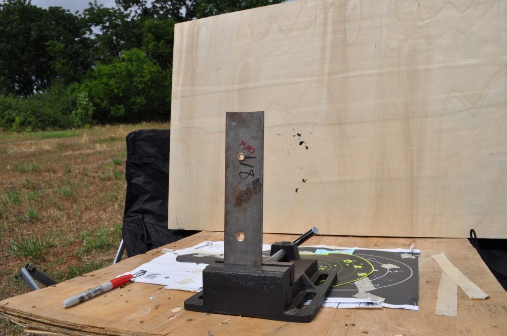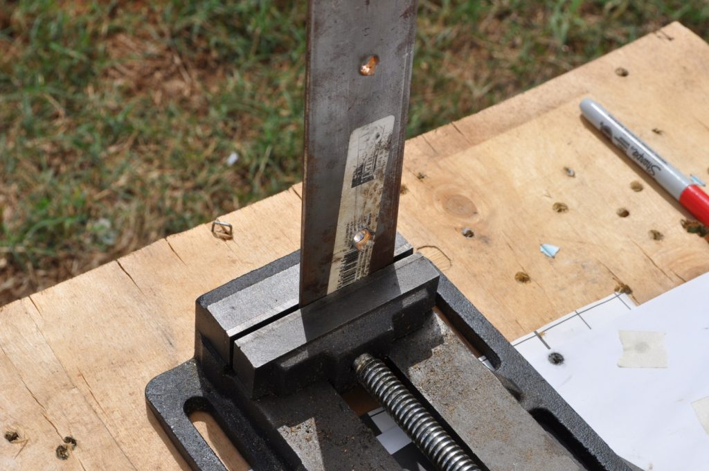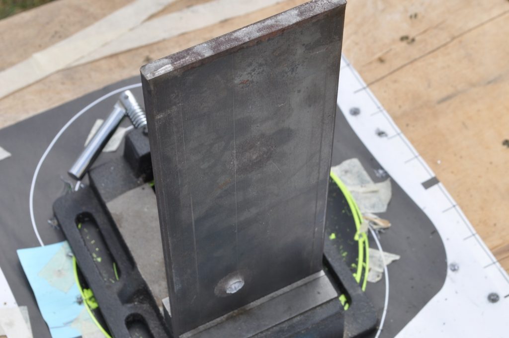 Shots were made at a distance of 27 yards. All targets are mild steel and with the exception of the last plate in the ¾ inch stack have not had any significant alterations which might affect the test (the last plate in the ¾ stack has several weld beads on it). Some thicknesses were met by combining two plates to double the total plate thickness, these plates were clamped together. All targets were held in a drill press vice.