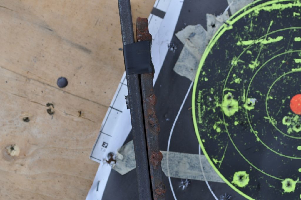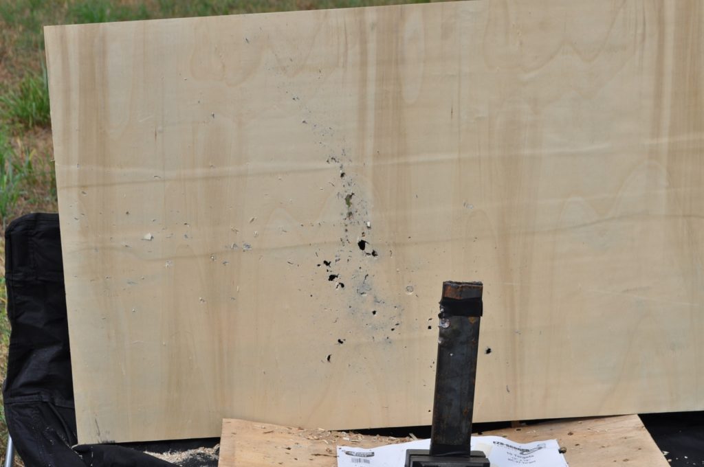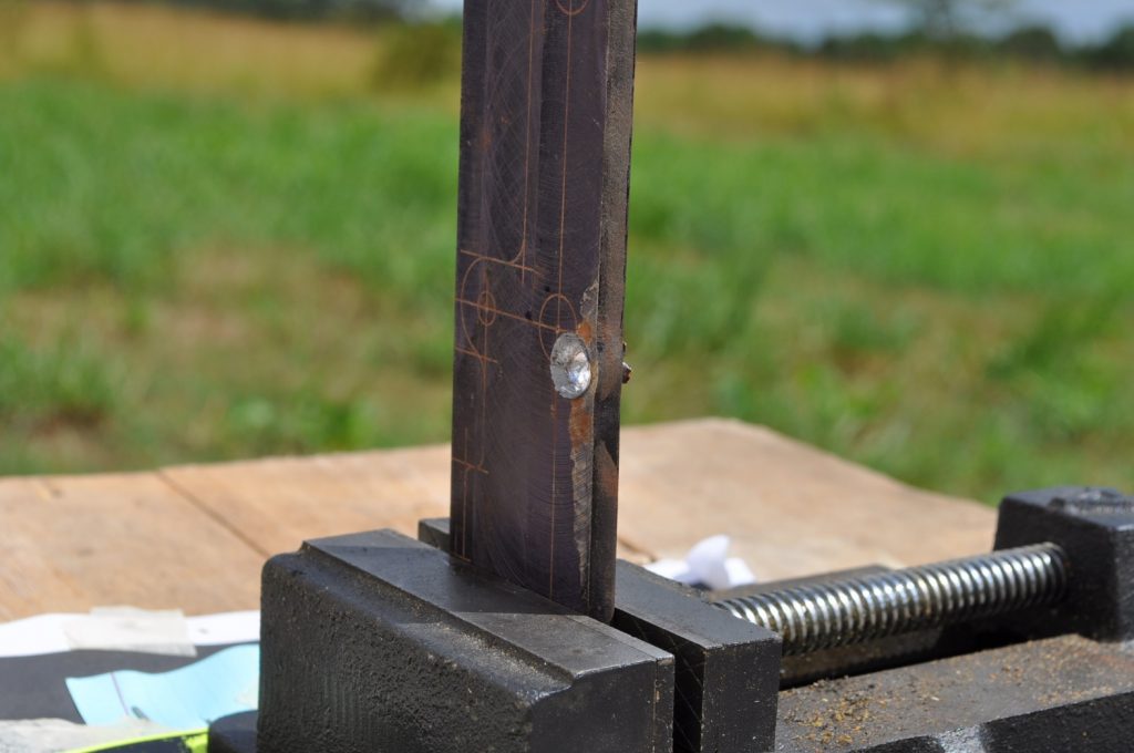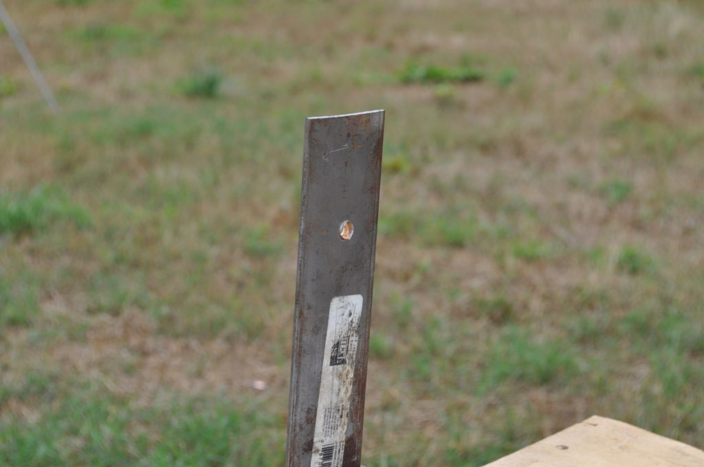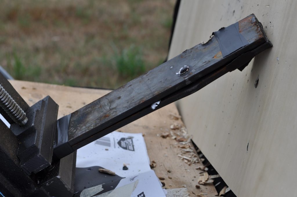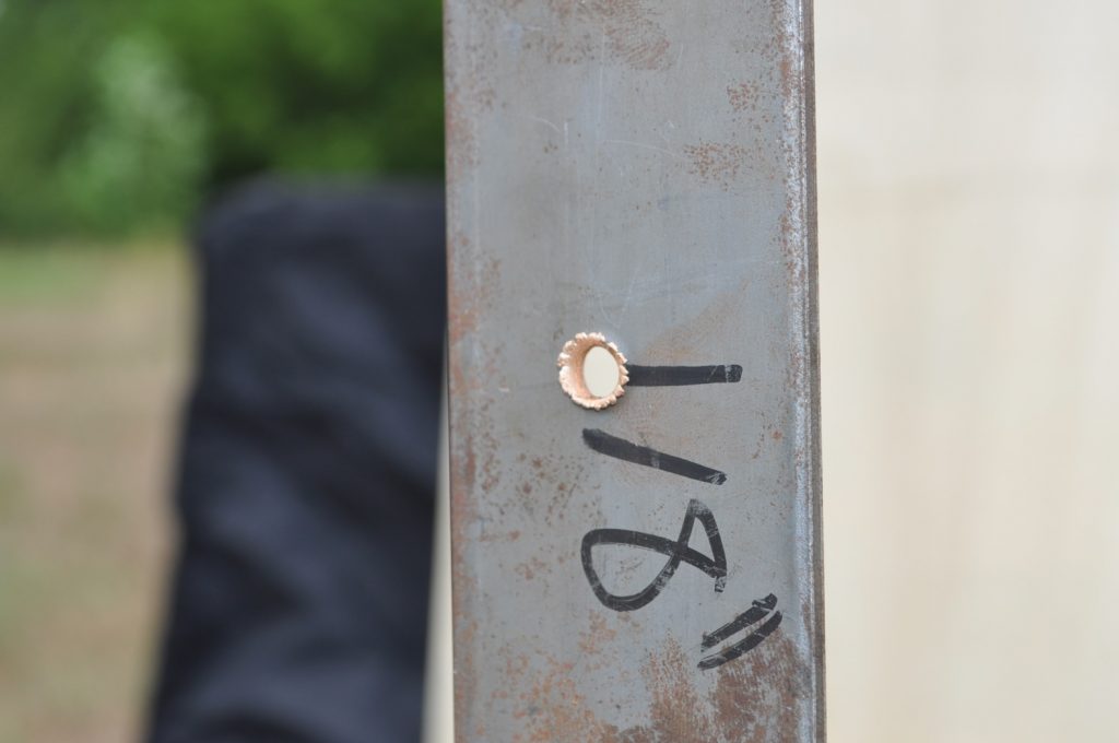 Shots were made at a distance of 27 yards. All targets are mild steel and with the exception of the last plate in the ¾ inch stack have not had any significant alterations which might affect the test (the last plate in the ¾ stack has several weld beads on it). Some thicknesses were met by combining two plates to double the total plate thickness, these plates were clamped together. All targets were held in a drill press vice.