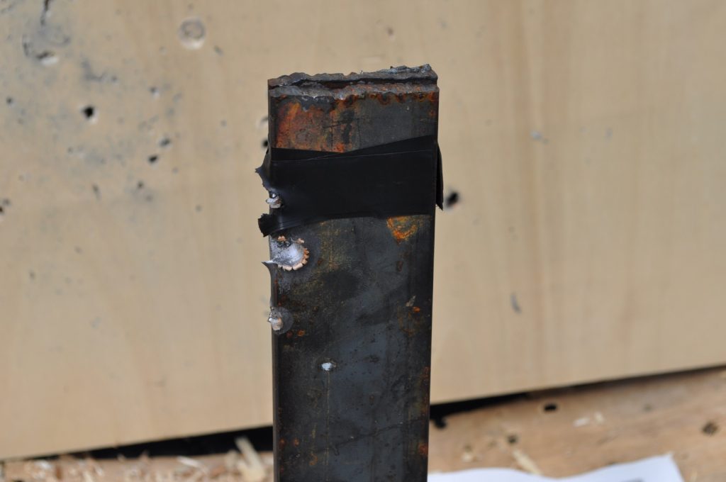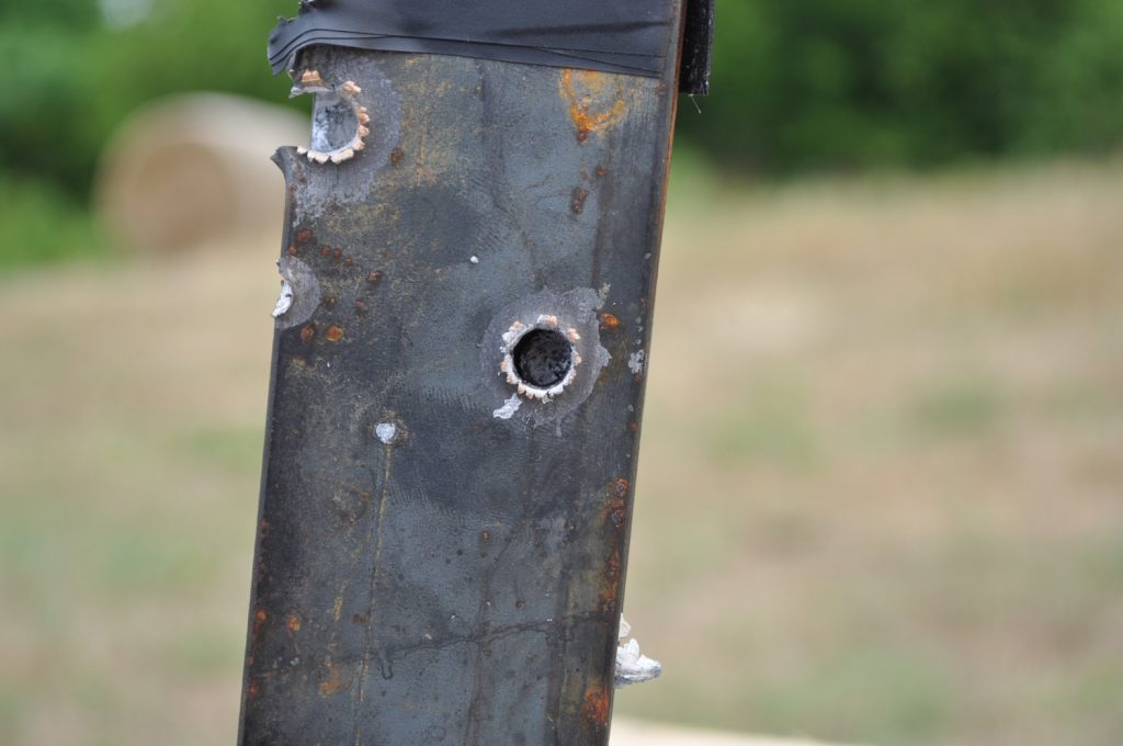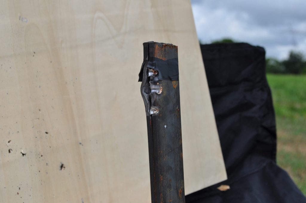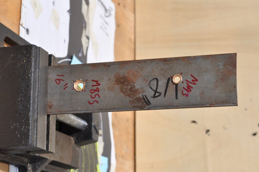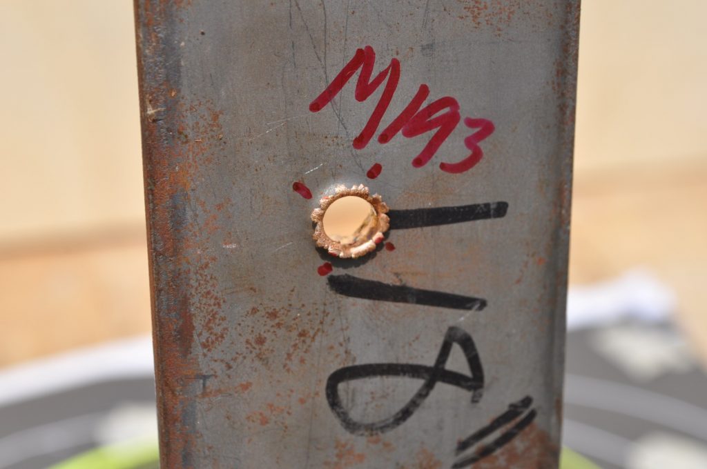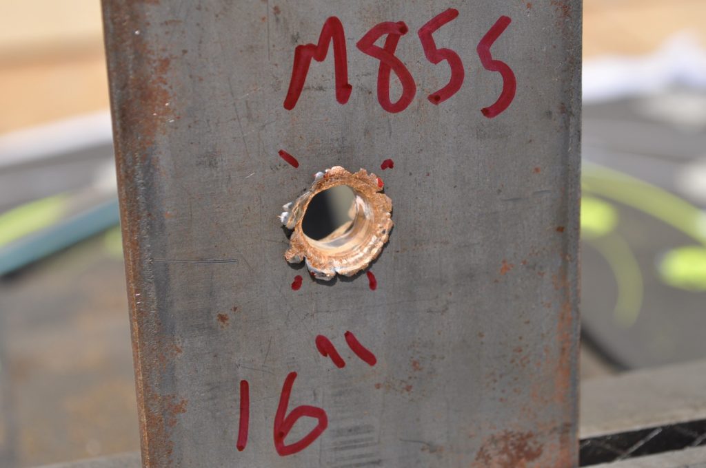 1/8th inch and ¼ inch plates offer practically zero protection from either of the bullets and create dangerous secondary projectiles and spalling. It might be better to avoid this type of cover in its entirety due to the secondary projectiles. 3/8ths inch plates may offer you some protection, especially against lower velocity rounds such as M855 but will not stop faster moving bullets such as M193. ½ inch plates and up offer consistent protection and are ideal for cover. It should also be noted that the further the bullet has to go to reach the plates the more effective they are at stopping the bullets. Examining the rounds themselves it appears that M855 projectiles do not affect the target in a consistent way, with some penetrators separating from the rest of the projectile and some sticking together the whole way through the target. From these results it seems M193 is the better round for penetrating steel barriers. Additionally the effects of spalling and fragmented bullets are devastating and must be a factor in cover selection and when selecting body armor.