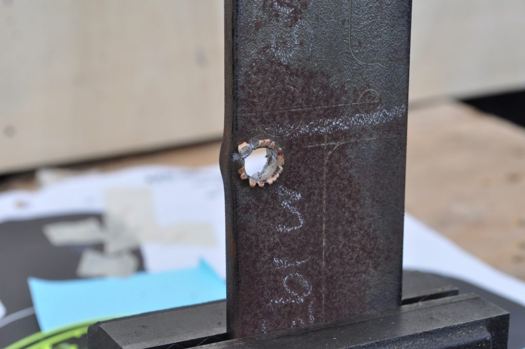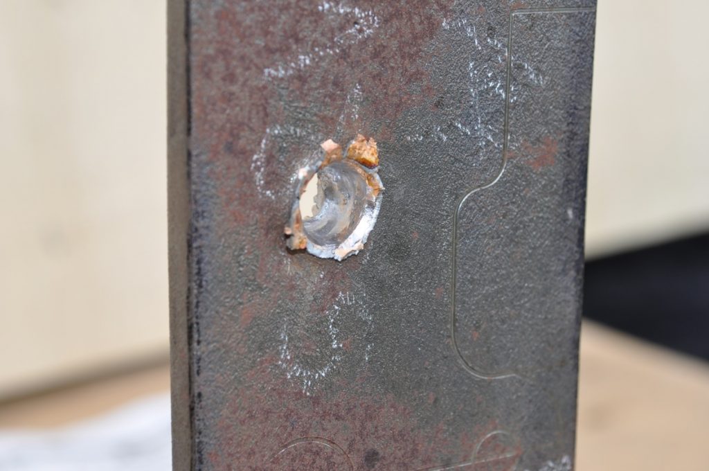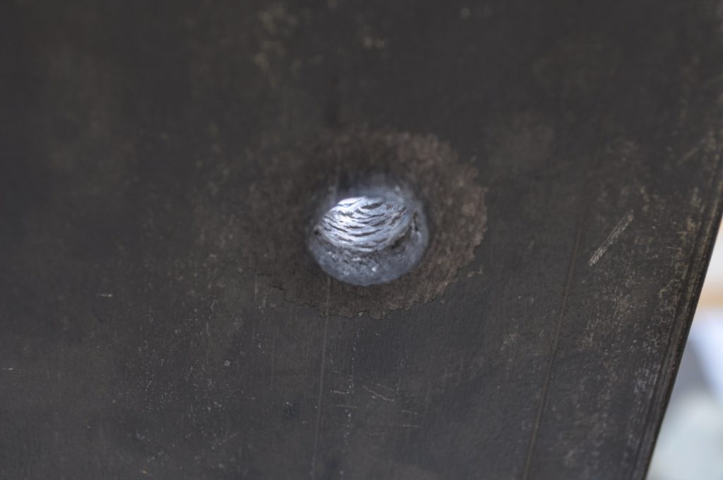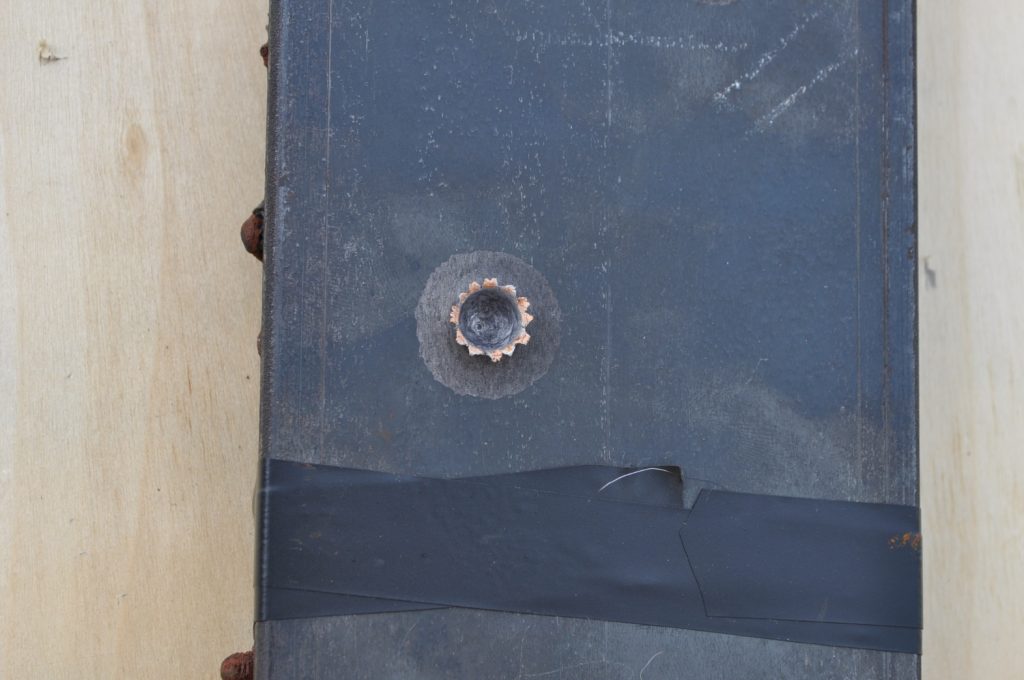 M855 did not penetrate the 3/8ths inch plate. Oddly enough there is very little disturbed material on the rear, only a slight bulge (OwO). It appears most of the round’s energy acted on the front face creating a crater twice the diameter of the projectile. Most of the jacket seems to have come off the target as spalling with only a slight amount transferring to the plate. The steel core did seem to penetrate further than the rest of the lead projectile made apparent by the deeper, smaller diameter hole. A view of the rear face, notice the very slight bulge on the upper portion of the plate. The lack of material disturbance is very strange and warrants further investigation. It is possible that this is how the round behaves naturally, shedding the lead on impact and relying on the steel core for all of the penetration. A good view of the depth reached by the penetrator.