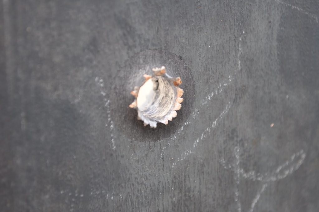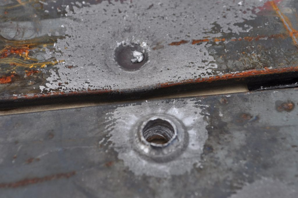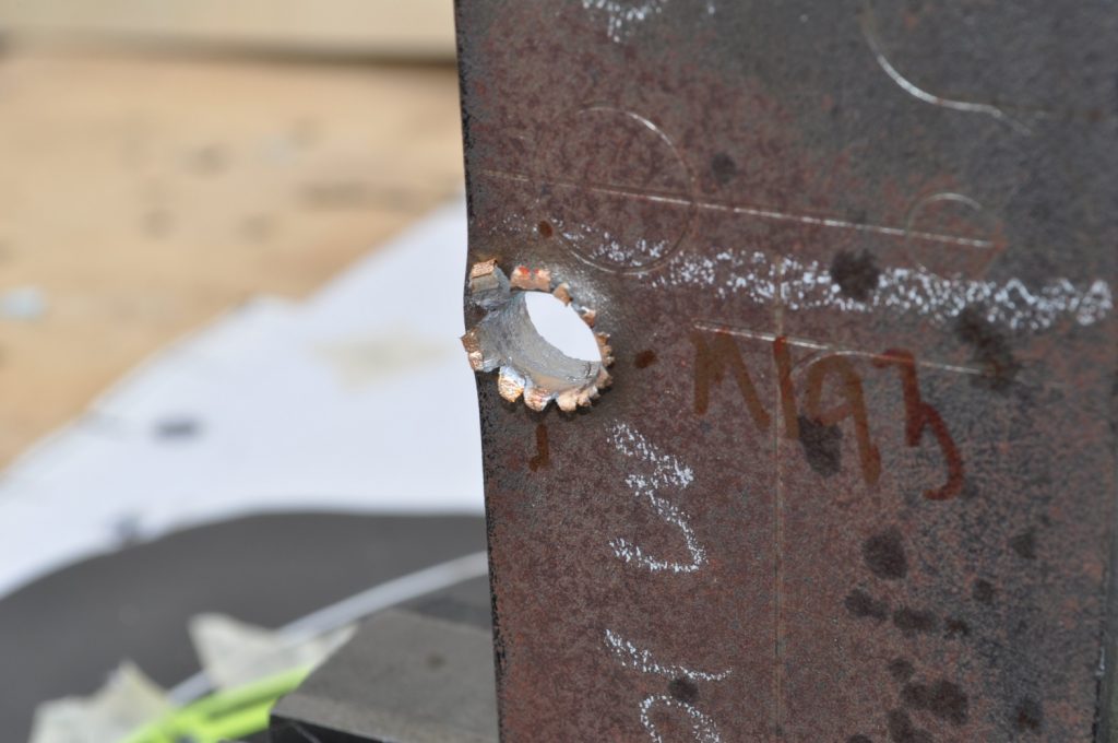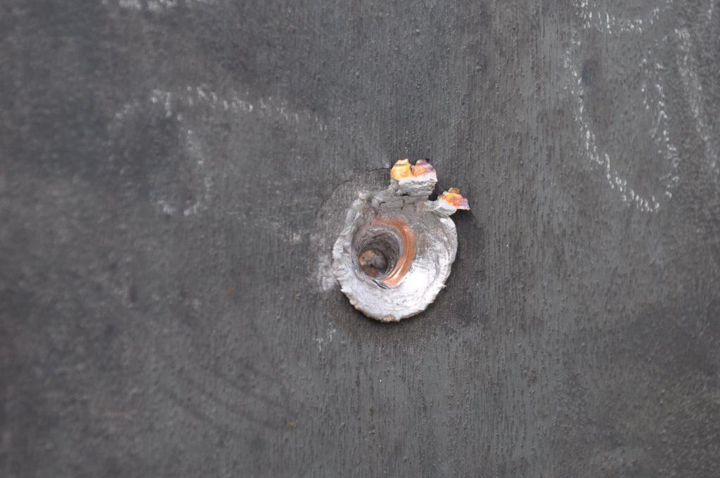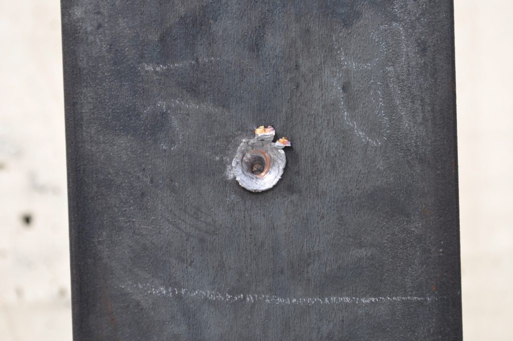 M855 did not penetrate the 3/8ths inch plate. Oddly enough there is very little disturbed material on the rear, only a slight bulge (OwO). It appears most of the round’s energy acted on the front face creating a crater twice the diameter of the projectile. Most of the jacket seems to have come off the target as spalling with only a slight amount transferring to the plate. The steel core did seem to penetrate further than the rest of the lead projectile made apparent by the deeper, smaller diameter hole. A view of the rear face, notice the very slight bulge on the upper portion of the plate. The lack of material disturbance is very strange and warrants further investigation. It is possible that this is how the round behaves naturally, shedding the lead on impact and relying on the steel core for all of the penetration. A good view of the depth reached by the penetrator.
