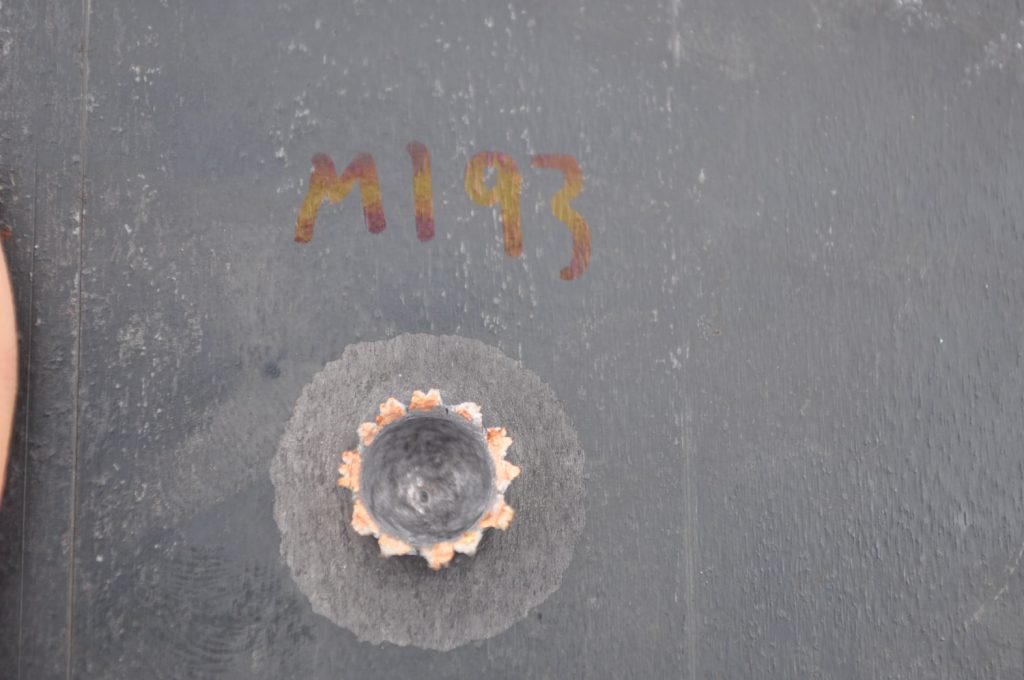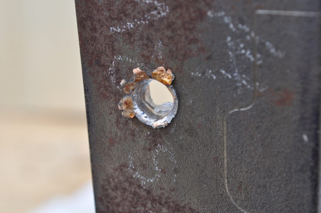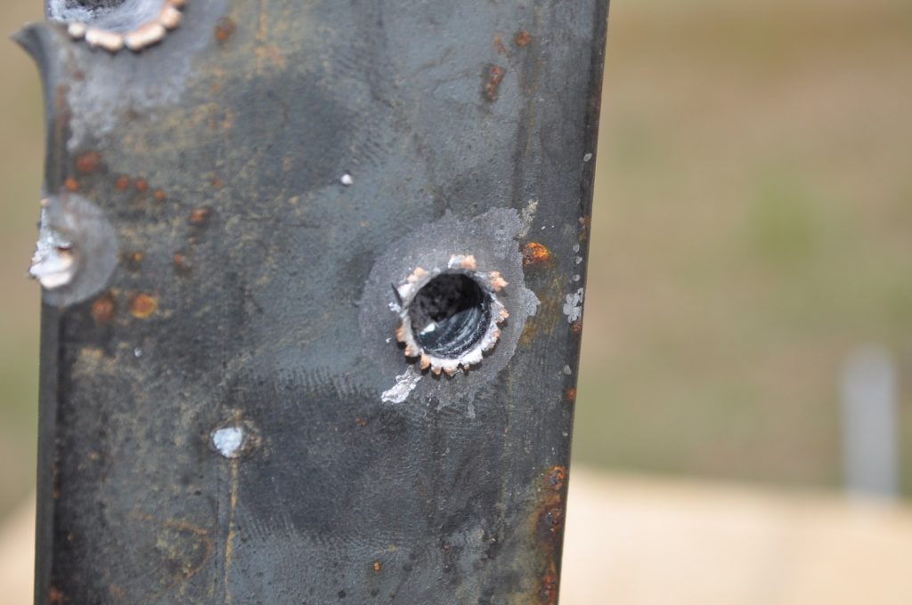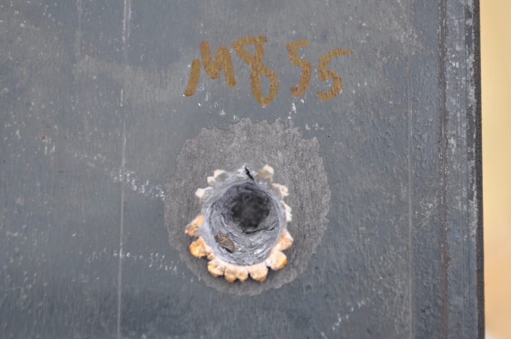 M855 also made it through the ¼ inch plate with no problems. It seems to have transferred less of the jacket and created a smoother bore than M193 but it did disturb more material on the rear face. A view of both shots. M193 marked on the bottom. Interestingly the transferred jacket is darker than the M193 jacket, this is most likely due to greater heat somewhere in the M855’s jacket transfer process causing the metal to change color. Spalling is no joke. A better view of the bore. Once again a rough exit hole, disturbing a similar amount of material as it did on the 1/8th inch plate