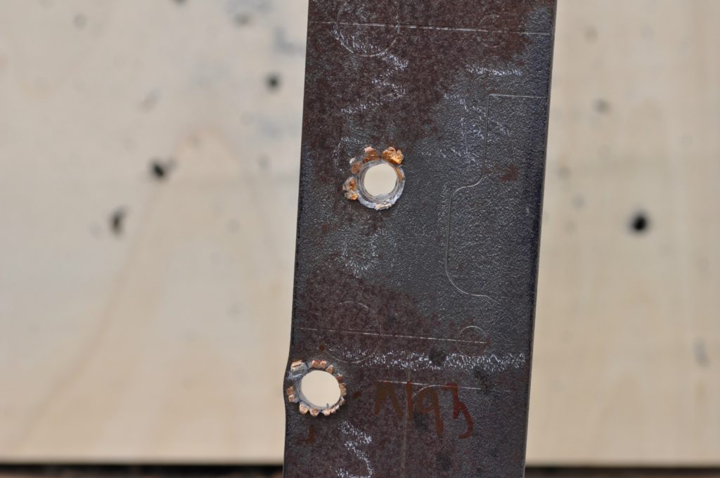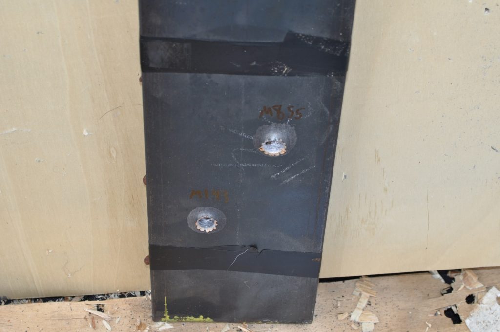 M855 also got through the 1/8th inch plate with no problem. Here we also see significant jacket transfer like the M193 but it appears the M855 has moved more material, indicating more energy being transferred to the target. As shown in the additional images the hole created was rough, particularly on the back face which shows a large amount of material disturbed from the exit hole A view of both shots. M193 at the top and M855 at the bottom. Notice a lower amount of projectiles in the backdrop A better view of the jacket transfer and mushrooming A view from the rear. Notice the amount of disturbed Another rear view