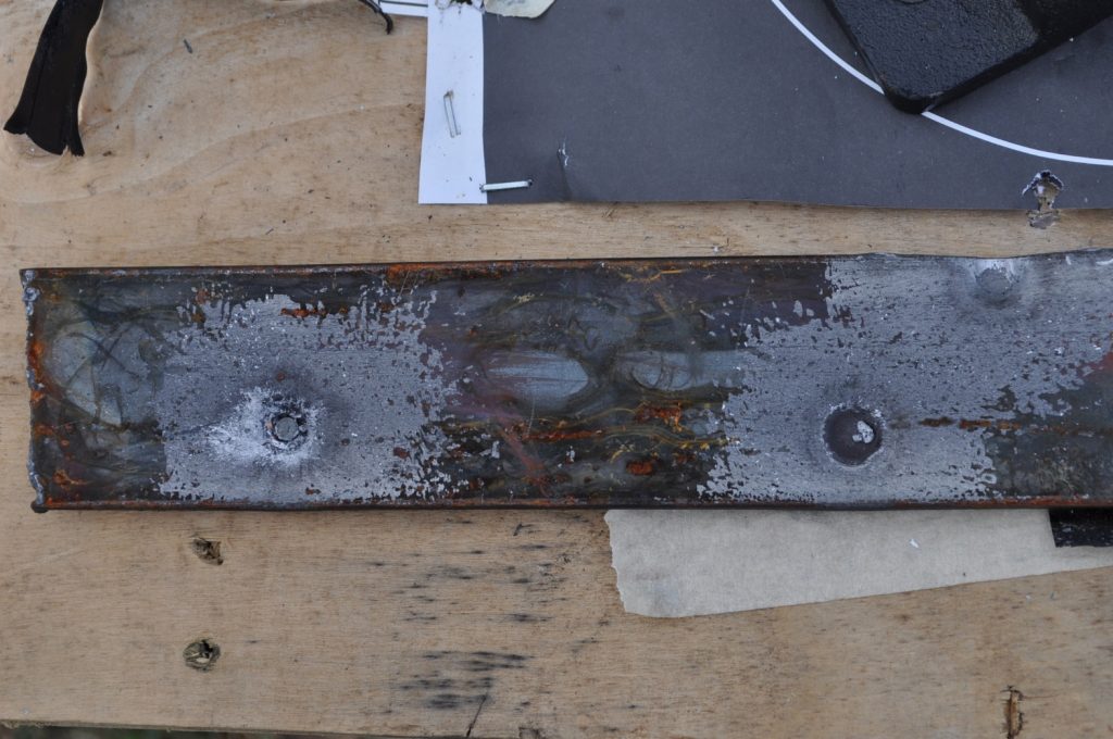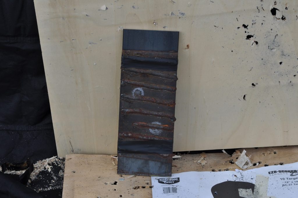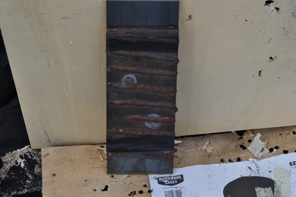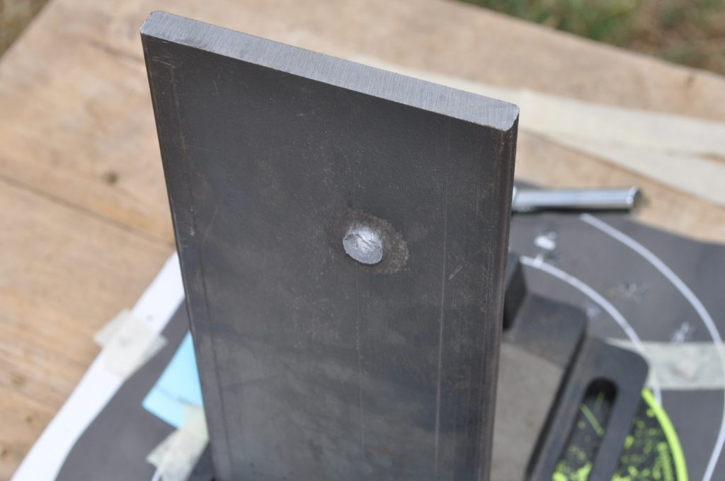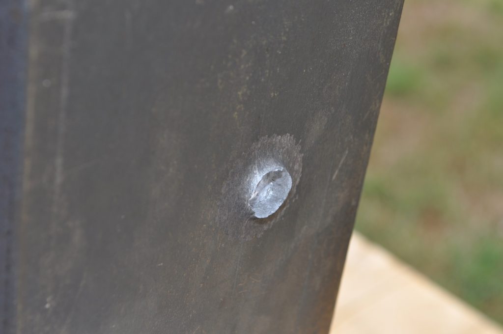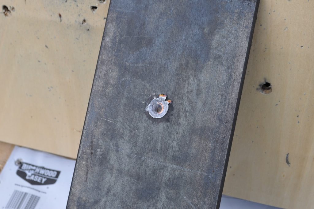 Unsurprisingly M193 wasn’t able to get through the ¾ inch plate. This shot left a pretty nice crater, but it doesn’t appear to have even made it through the first plate in the stack. On the rear nothing appears to have occurred other than the mill scale being knocked off, not even the formation of a bulge. However it should be noted that the effects on the rear plate are being altered by the weld beads on the back, while this effect is most likely negligible it should be taken into consideration. A view of the rear plate. The impact happens to be in the center of the bead. A side view showing no significant material displacement. The slug from the previous plate is visible in the background. A close up of the crater.