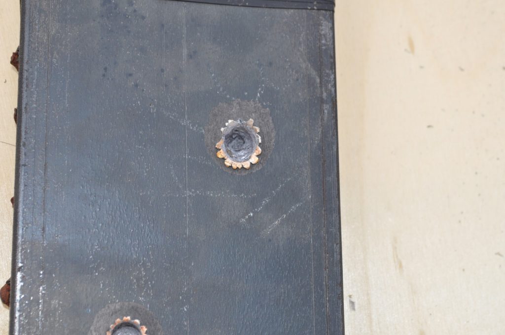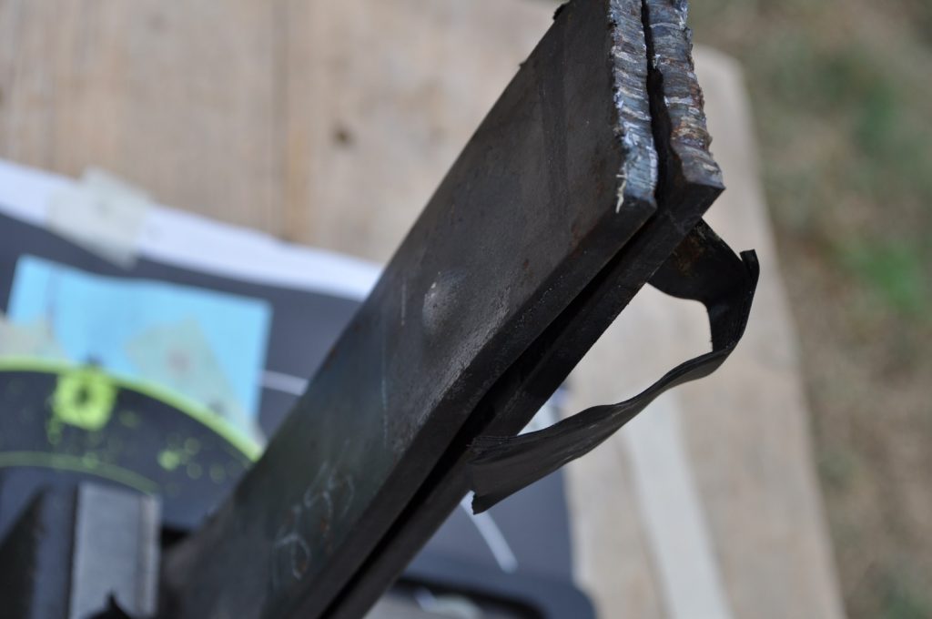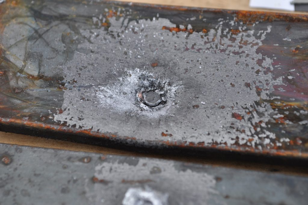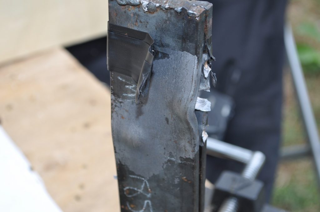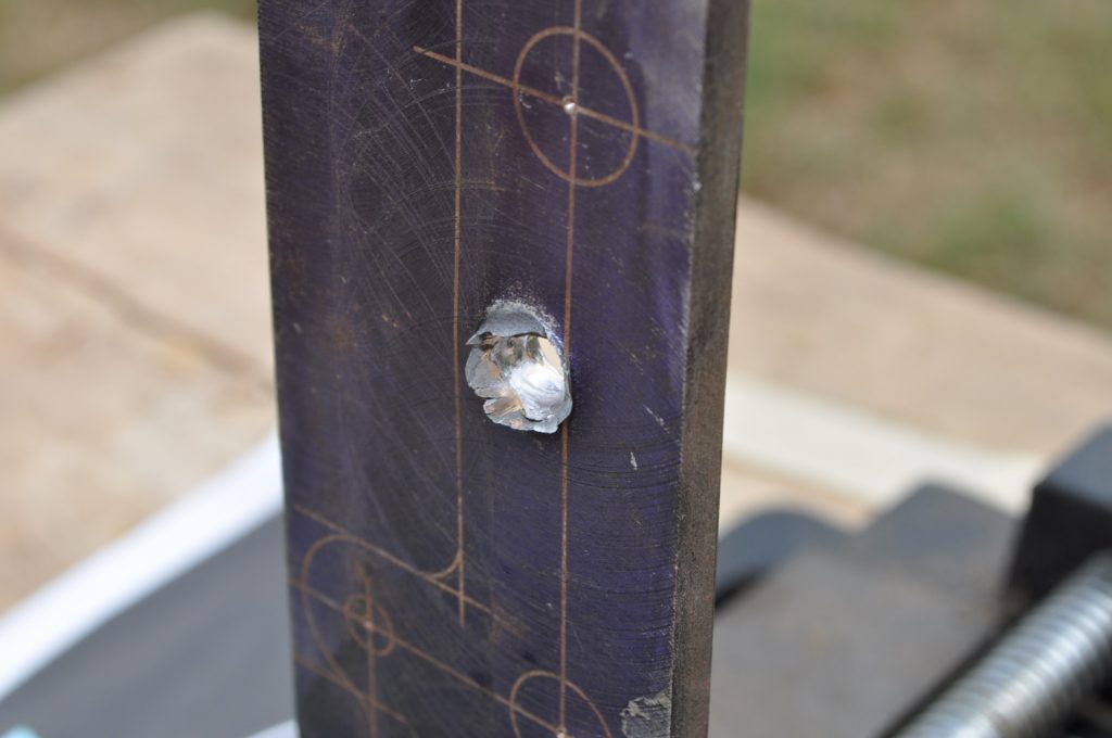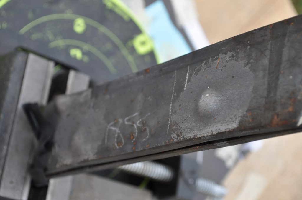 Unsurprisingly M193 wasn’t able to get through the ¾ inch plate. This shot left a pretty nice crater, but it doesn’t appear to have even made it through the first plate in the stack. On the rear nothing appears to have occurred other than the mill scale being knocked off, not even the formation of a bulge. However it should be noted that the effects on the rear plate are being altered by the weld beads on the back, while this effect is most likely negligible it should be taken into consideration. A view of the rear plate. The impact happens to be in the center of the bead. A side view showing no significant material displacement. The slug from the previous plate is visible in the background. A close up of the crater.