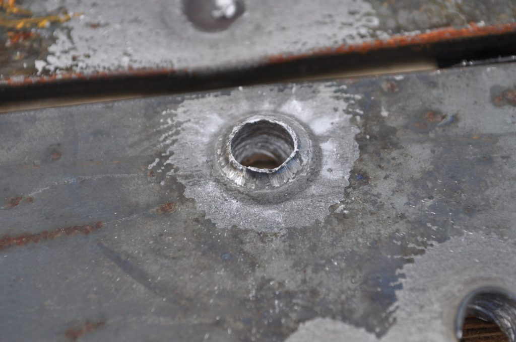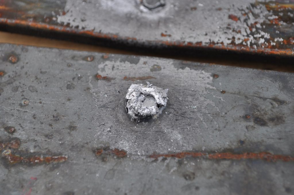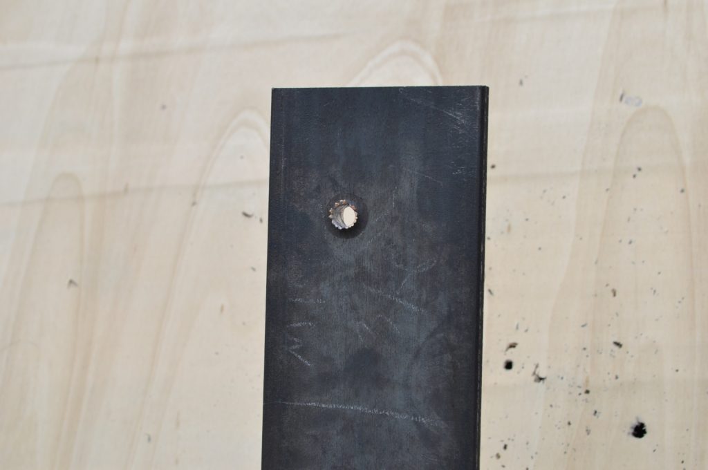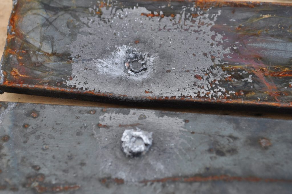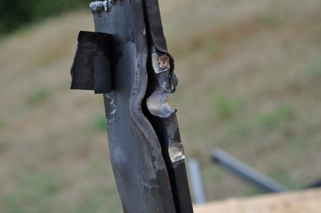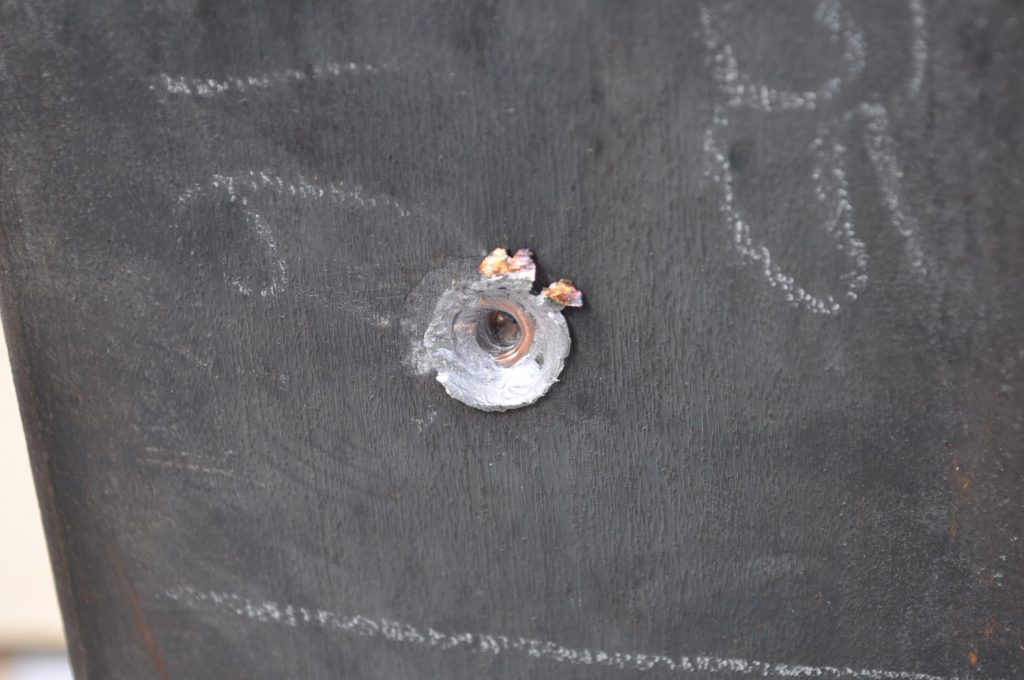 Unsurprisingly M193 wasn’t able to get through the ¾ inch plate. This shot left a pretty nice crater, but it doesn’t appear to have even made it through the first plate in the stack. On the rear nothing appears to have occurred other than the mill scale being knocked off, not even the formation of a bulge. However it should be noted that the effects on the rear plate are being altered by the weld beads on the back, while this effect is most likely negligible it should be taken into consideration. A view of the rear plate. The impact happens to be in the center of the bead. A side view showing no significant material displacement. The slug from the previous plate is visible in the background. A close up of the crater.