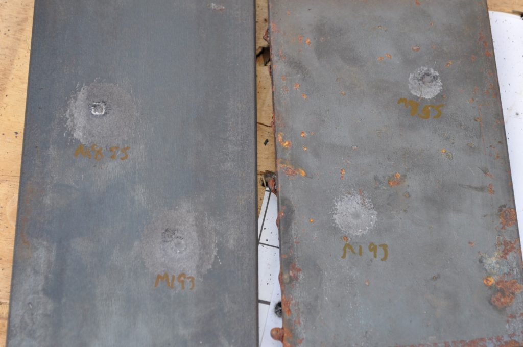 Since we seem to be hurtling closer to a civil war every day it would be prudent for you to know what you can shoot through and what you can hide behind. So we’ll be examining various types of cover to determine how effective different types of rounds are against them. To begin we’re going to be looking at some common types of 5.56 ammunition against varying thicknesses of steel plates. We’ll be using M855 and M193 for these tests.
