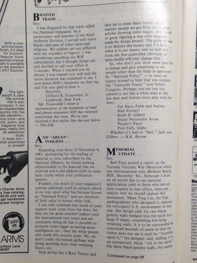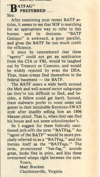 Here we have one of my favorite things I found while combing through SOF. It is what I believe to be the first printed example of the term “BATFag” from a letter to the editor, written by a reader who was looking to suggest a derogatory term to SOF in reference to the BATF for subsequent issues. This one technically came from outside my collection but it was too good not to include:
