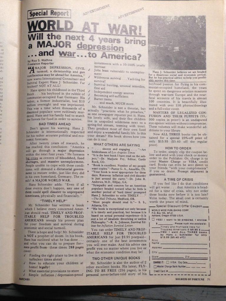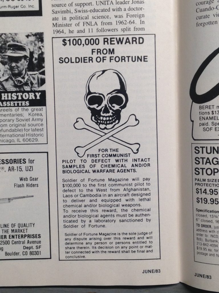 If MAD magazine was considered “edgy” for adolescent boys, SOF was what the edgy crowd graduated to when they entered their high school years. I was blown away, at the time, by the content and was intrigued by the war stories and photography from Cold War hot spots like the Rhodesian Bush War. It was also pretty cool to read the classified ads, many of which sought to recruit former U.S. military servicemen for mercenary work abroad