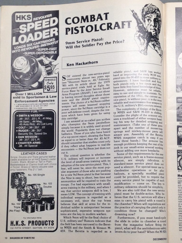 Pictured above is a particular gem from Hackathorn’s column “Combat Pistolcraft” that goes over the Beretta 92s very early testing for US Military adoption. And while his very boomer-esque rant about the inadequacies of the “stopping power” of the 9mm compared to the .45 is pretty laughable today, it was orthodox for the time period and is interesting to read.