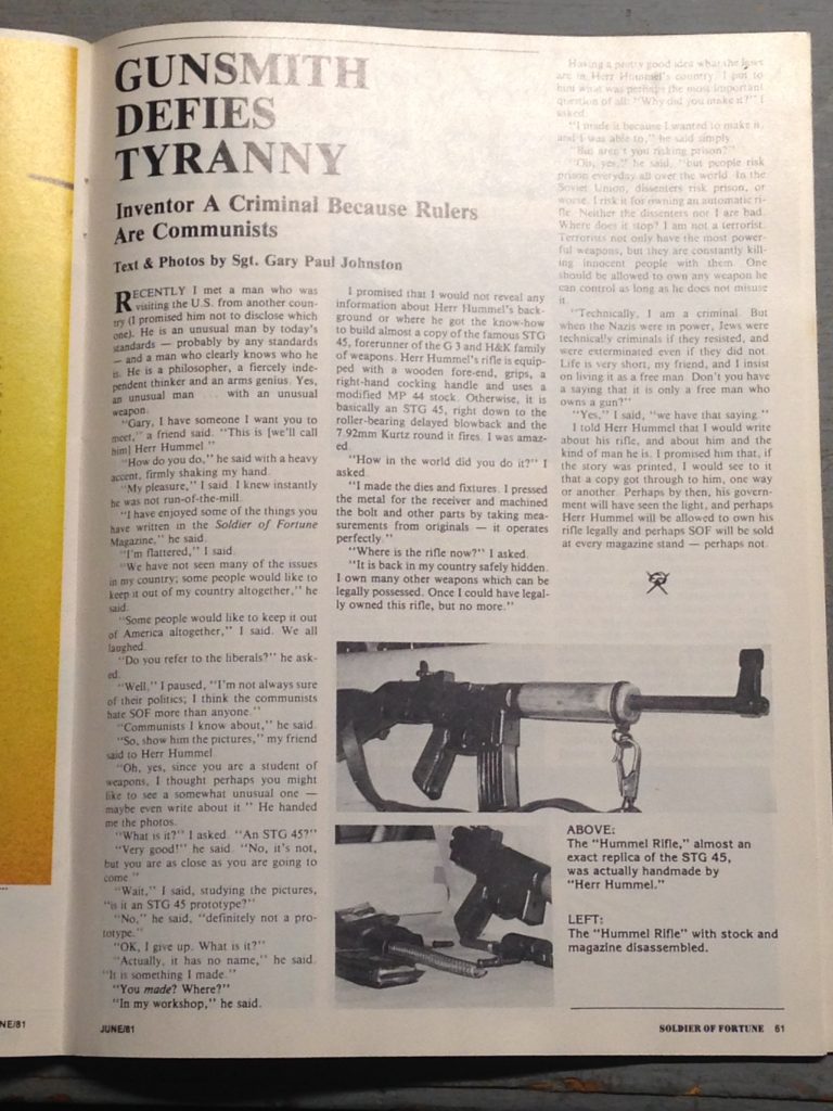 And this one about a European machinist behind the iron curtain, who in defiance of the government, not only stashed away a full auto STG45, but one that HE HIMSELF made in his garage: