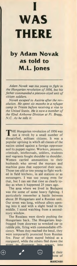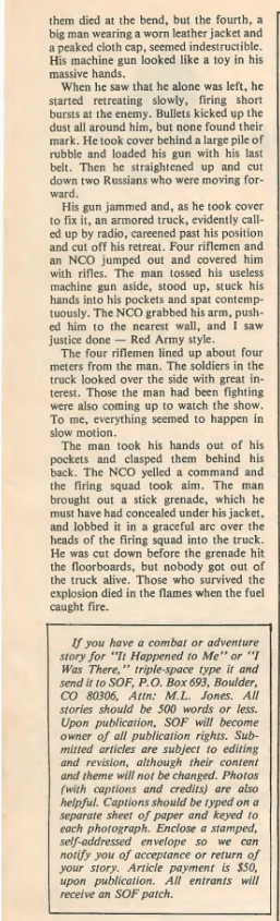 While there are plenty of articles about typical favorites such as the French Foreign Legion, MACV-SOG, Rhodesia, and other African bush warriors including mercenary captains like Mad Mike Hoar and Rolf Steiner, my truly favorite parts of what I found in SOF were articles that are analogous to the rare threads that contain really interesting personal stories. Check this one from a reader who recalls his childhood in Hungary during the Soviet occupation: