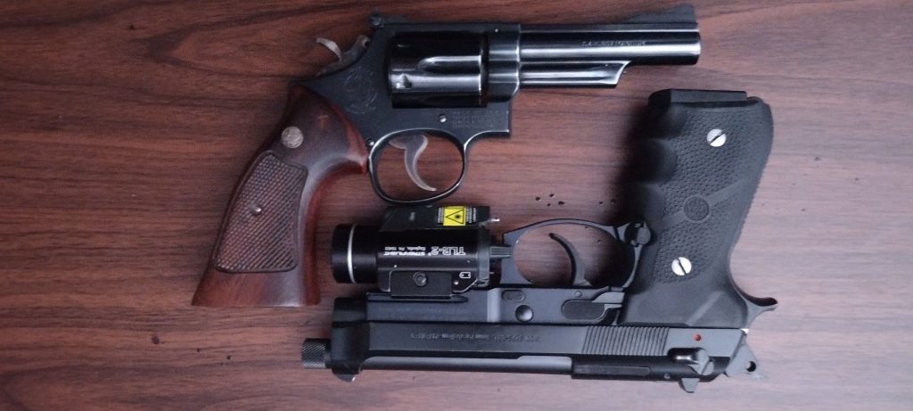 To explain the dilemma of the modern American police department around this time, I have decided to use a few visual metaphors here. To represent the classic American wheelgun that had become popular with the police agencies at around the 1950’s and 1960’s, a S&W Model 19. 4 inch barrel, target sights, thick S&W Rosewood grips and a .357 chambering so you can fill it with those aforementioned .38 +P’s. To represent the new and rising wondernine 9×19 handgun, we have a Beretta 92FS. In this case, it is a modern M9A1, but it’s still mechanically the same gun. 9×19 caliber, single action/double action and mag fed. Both guns in basic terms are the same, they are both single action and double action.