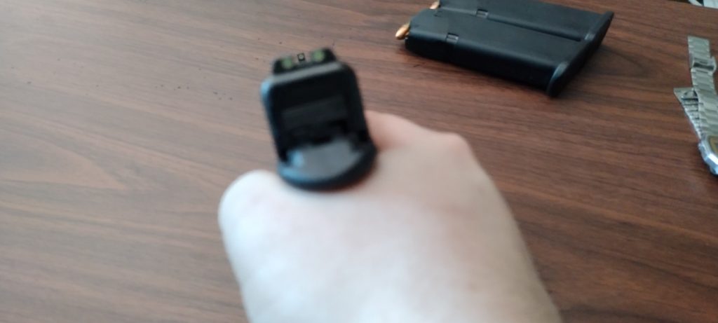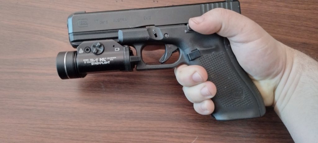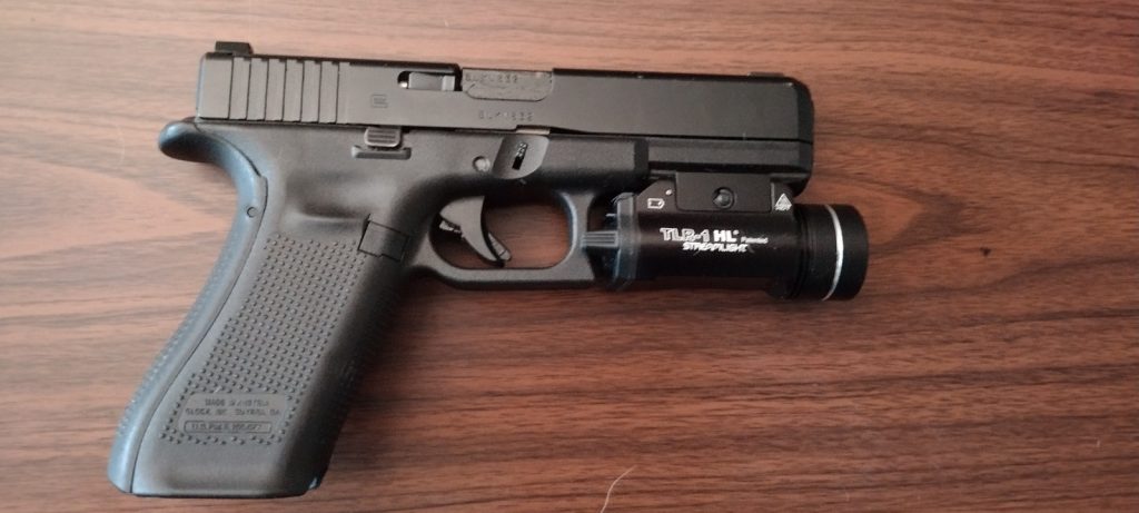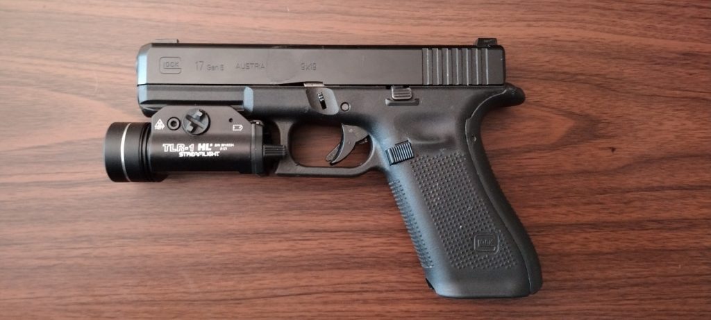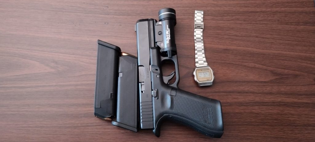 The grip is mildly textured with the standard Glock vague-stipples and in a way that invites any wannabe home gunsmith to begin making his own with a small drill bit and enough time. I personally like and dislike the stock Glock stippling. It’s good enough to grip the gun but it doesn’t hold on really well once my hands get sweaty for whatever reason. Goon tape or whatever method you do to scrub off the calluses of your hand is a good choice. Also since this is a Gen 5, we have removable backstraps. Or one. Mine was used, I only have one. And all I’ve done beyond that is slapped a TLR-1 HL on it. Because it’s the min-max of all weapon lights.