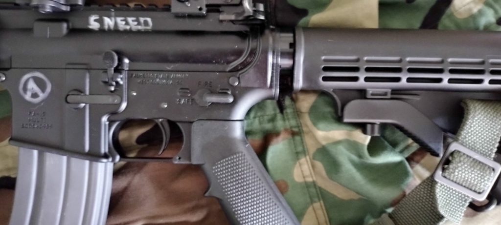 At the rear we have standard AR-15 everything, including a 6 position buttstock and a classic M4 collapsing stock. A little rattly, a little tinny and it makes one of the most overly mechanical feelings when you shoot it, but still fine. If it was any other rifle, I would probably go for something like an A5 buffer tube with either an H1 or H2 pattern of buffer in it, but again, base model AR, base model parts. This lower assembly is just a PSA Stealth-15 lower that I got cheap with a daily deal. I could use an Aero or an LMT, and I know that no one can or will care about that choice. No one will fawn over me and praise me as a new deity because I used a fancy lower on a poverty M4 I built for funsies. As such, all the other parts down here are standard.