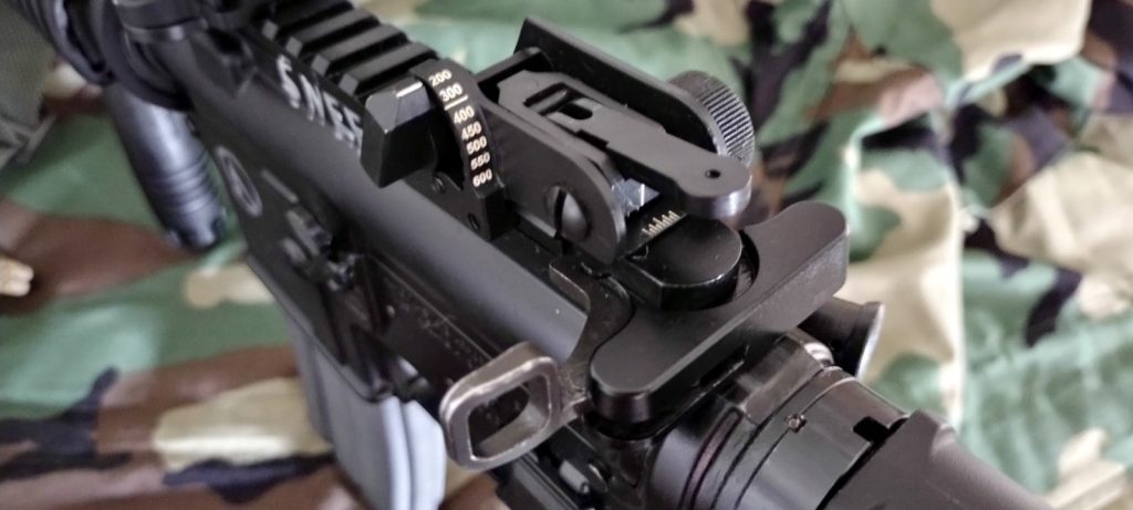 Speaking of looks. It’s time to mention sights. And the Dr. Jekyll and Edward Hyde situation on this rifle. You see that BUIS and we’ll get to him, but first let’s talk about the nice thing. The Aimpoint.