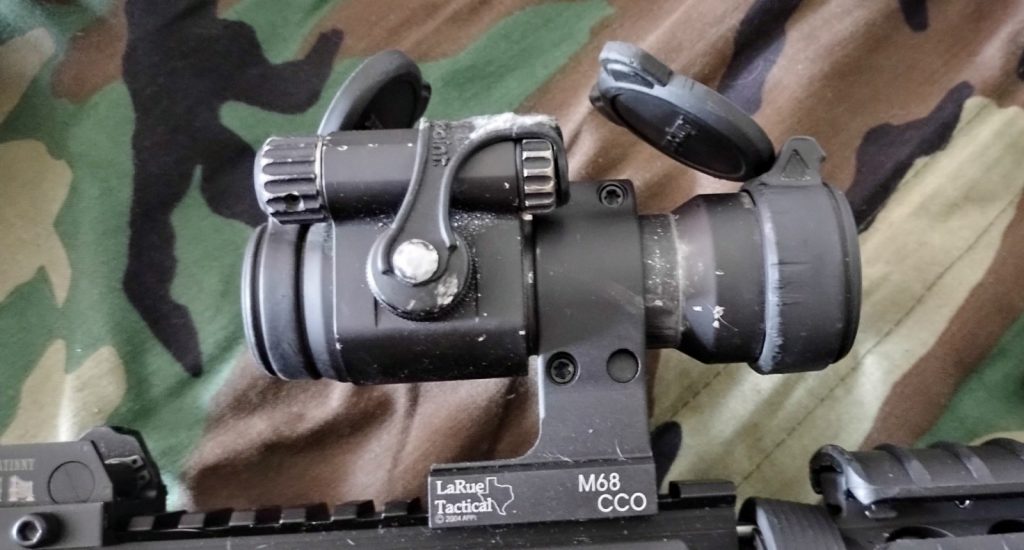 The CompM2, here represented by a surplus one you can find by the utter truckload on Ebay, is the sight you almost expect from a Block I equivalent rifle. It’s either this, an actual M68 CCO or an ACOG. And on a CCO mount like this, a LaRue model that allows you to get a good lower 1/3 cowitness on the front sight post. No absolute like you would with EOTech’s on rifles like this.