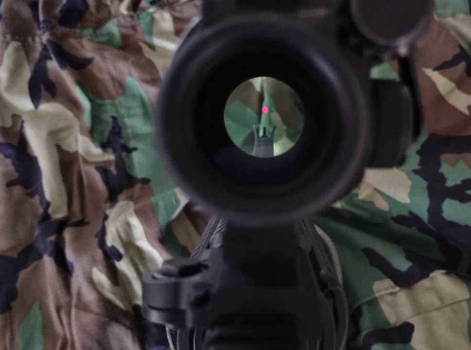 Despite the age and overall rough exterior of this optic, it’s still a classic Aimpoint with very clear glass and a crisp reticle, with a large amount of settings that you can spin through with the now iconic rear adjustment dial for any levels of brightness, from “NV usable” to “Finding out you might have astigmatism the hard way”. It’s a solid red dot, one of the most iconic in the modern era and the one that really helped establish Aimpoint as we know them today. If you don’t want as junky looking of a Red Dot, using an Aimpoint PRO is also applicable. But if there’s one thing you must not copy, it’s the rear sight.