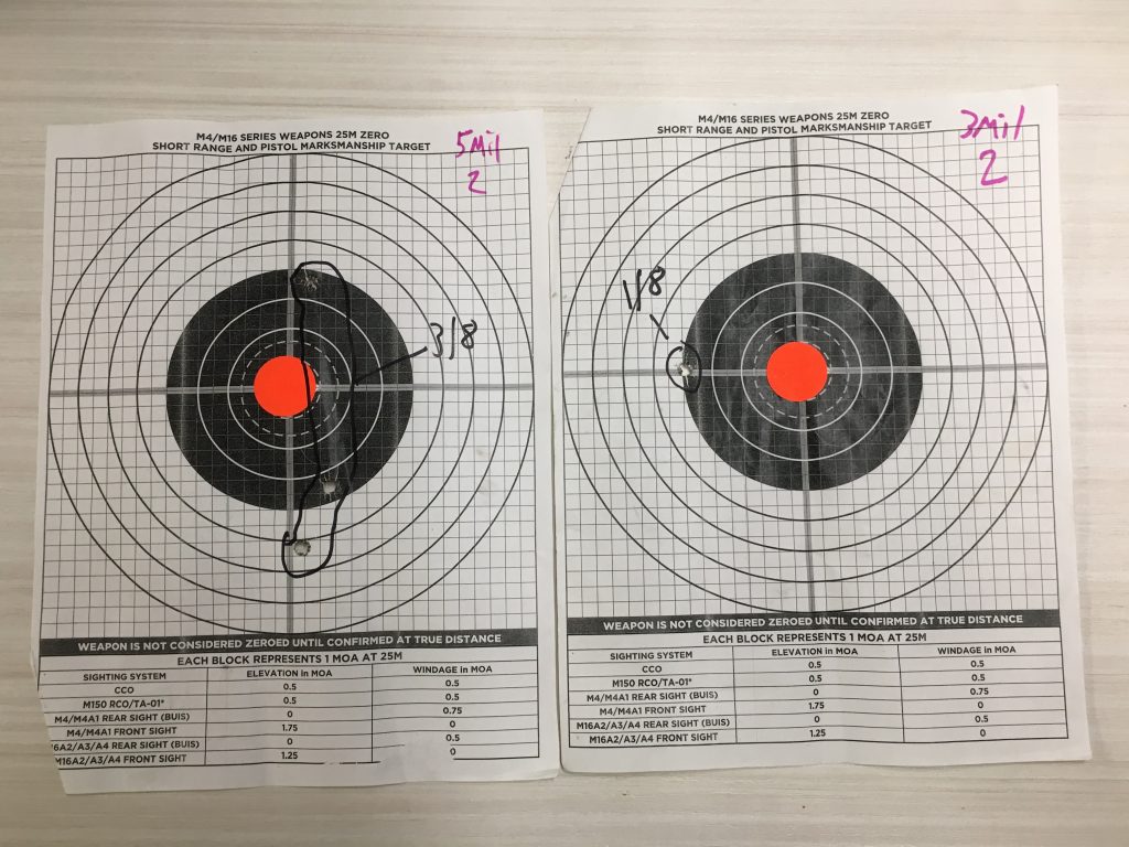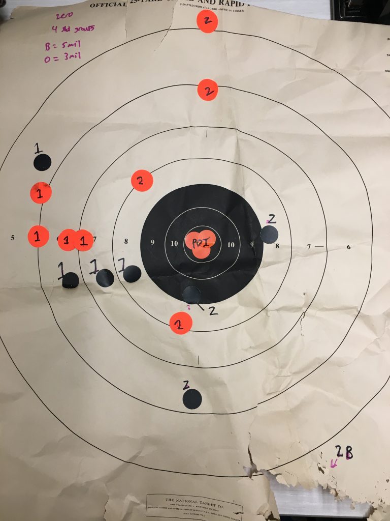 The group improved for the 3mil gun on the second target scoring 7/8 shots on target in a hand sized group while the 5mil gun only had 3/8 way spread out: