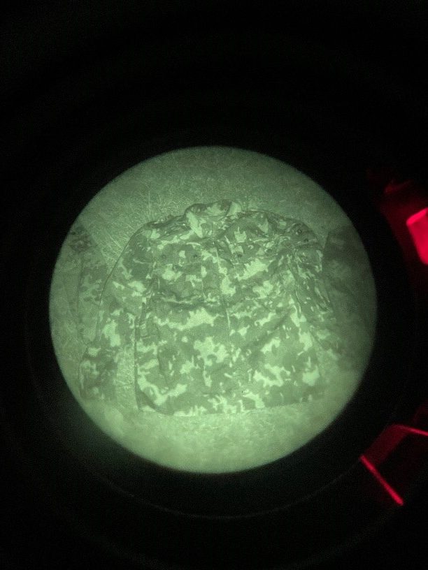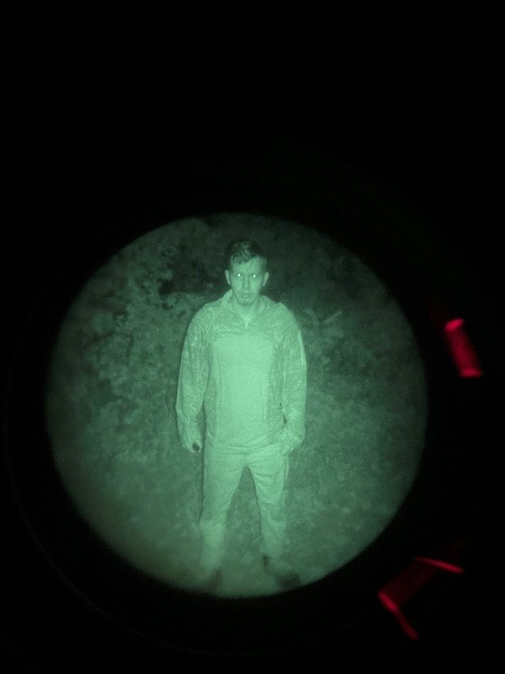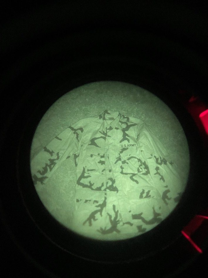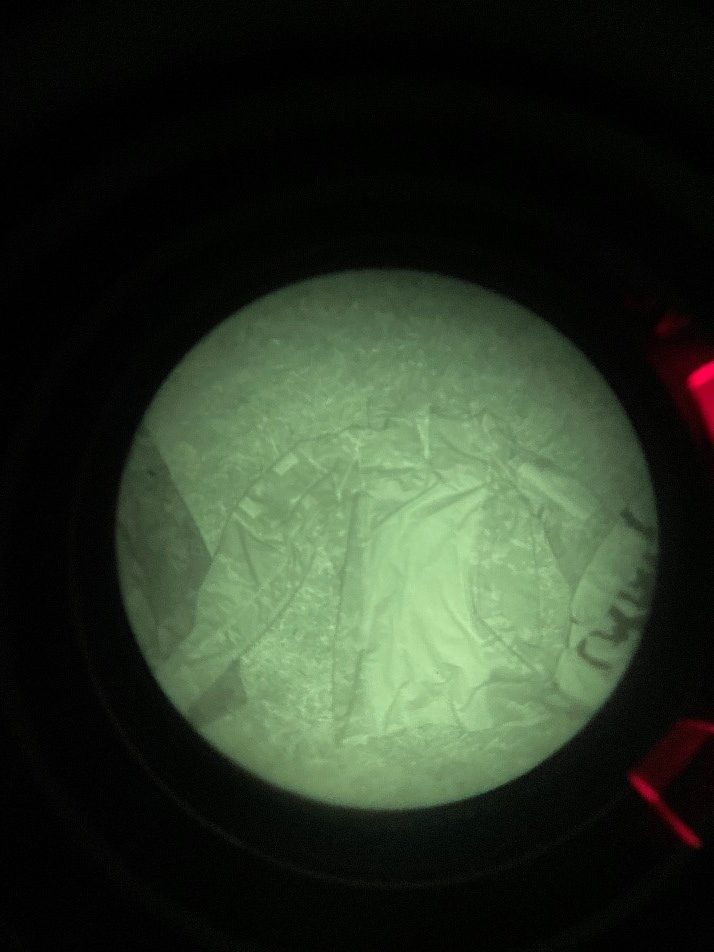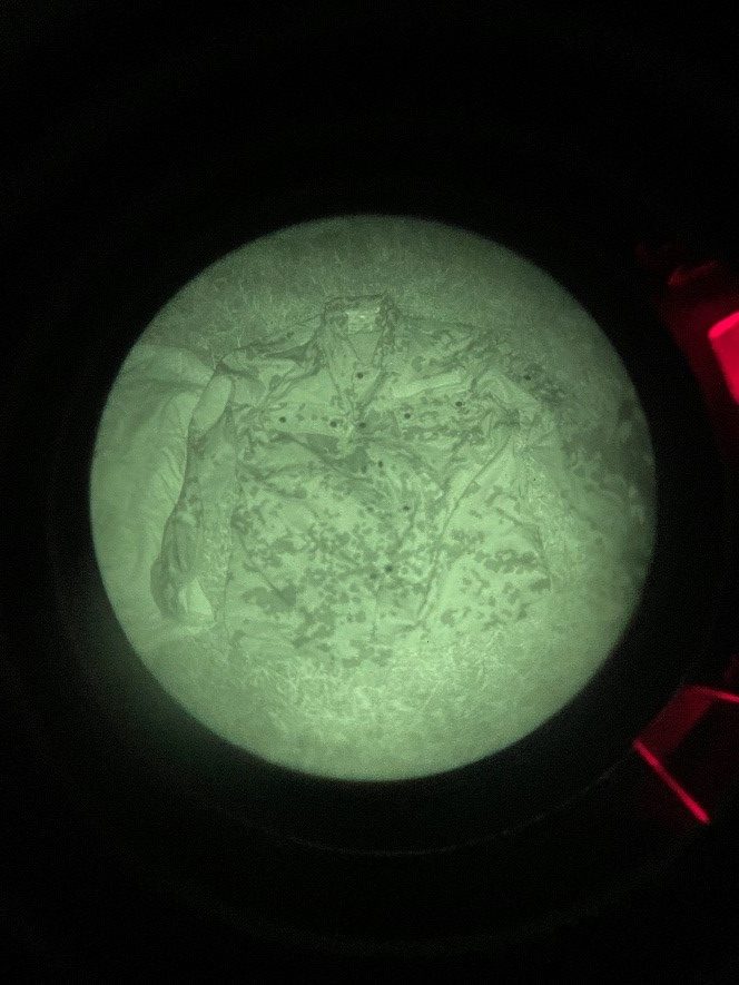 The Night vision used was a gen 3 Omni VII PVS-14 with a Low Light Innovations white phos filter to improve image clarity and the IR illuminator was the on-board with a standard PVS-14. Not only is this what I personally have but anything brighter at this close of a range would flood the image with way too much light for a visible distinction between the tested camo and the background that we are trying to blend into (poverty cope I know).