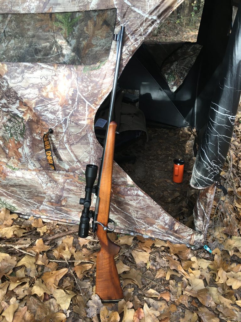 About 20 minutes after my bladder could no longer hold its coffee anymore and I was back from a quick pee break, my overactive ears again heard some leaves crunching about 100 yards out to my 10:30 and I looked that way. Bingo. Small doe by herself coming from the 10:30 to 4 oclock. I saw her go behind a tree and when she did, I brought the rifle up and rested it on the side of the blind as smooth and quiet as I could. I thought I did ok, but when I found her at 3x, she was already looking at me. It was a quartering shot at about 70-80 yards and I did my best to stay calm and put the center crosshair carefully to the sweet spot. My finger rested on the trigger and I pulled through the heaviness until the gun jolted back into my shoulder.