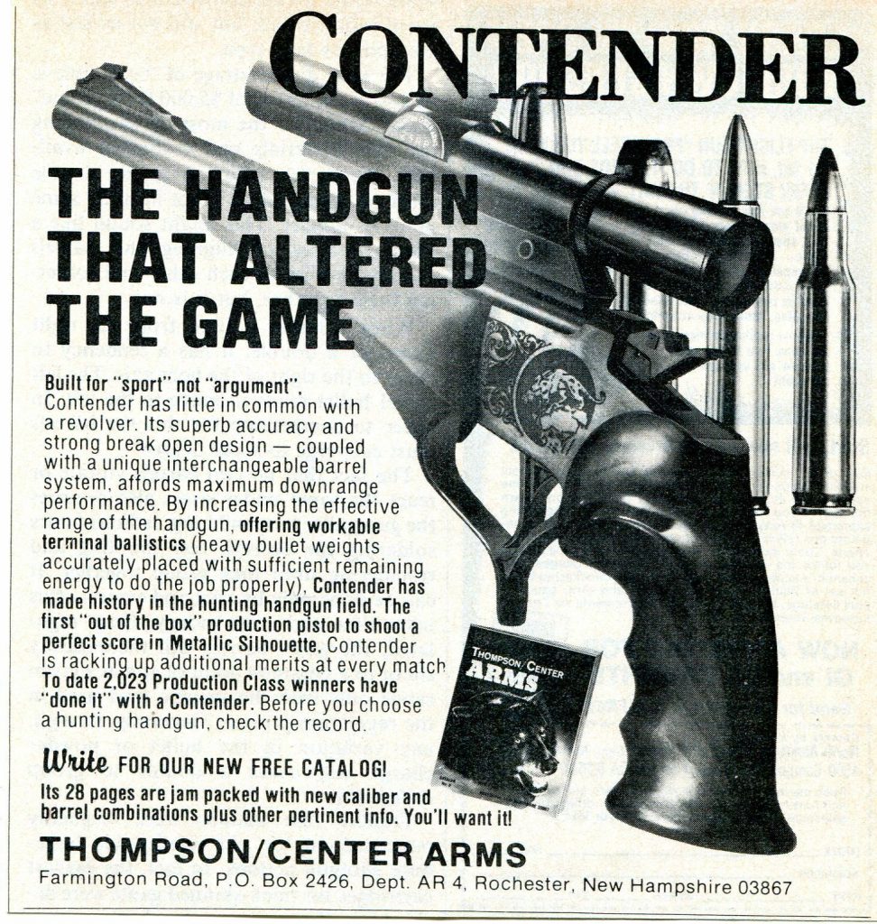 By the 1980s telescopic sights were being offered commercially along with handguns. These optics and pistols are designed to extend the range of a handgun, and not necessarily used for close ranges nor for speed. Such examples include the Charter Arms AR-7 Explorer II semi-automatic pistol with a magnified optic, and the Thompson Contender single-shot handgun with a magnified optic.