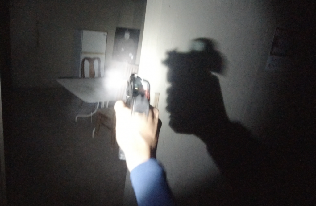 The author engaging a target in a nighttime shoothouse with the MR920