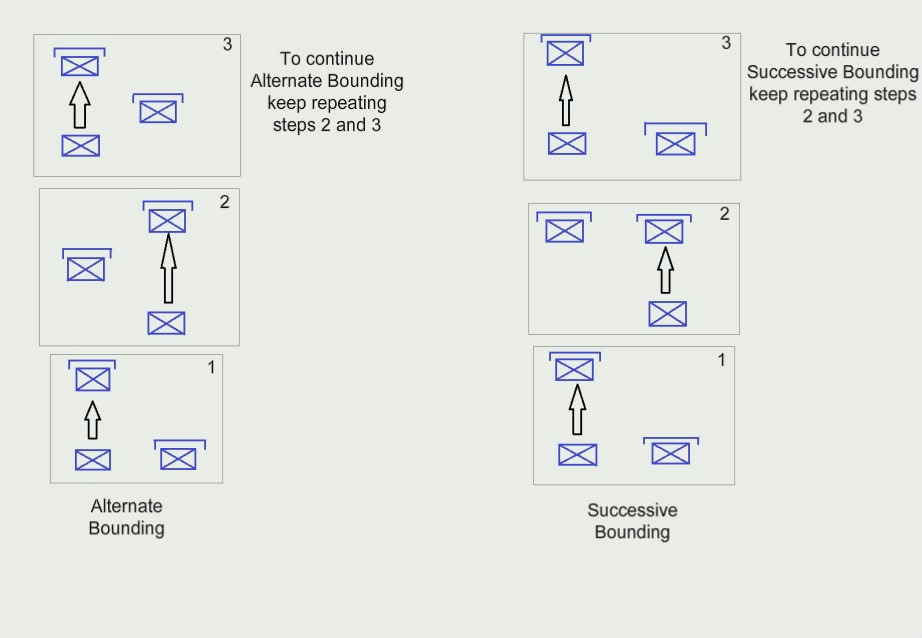 Both types of bounds have their uses. Successive bounding is good when part of a larger element, and you want to ensure good control at a moderate pace, be it fear of overextension or a high volume of enemy fire. Alternate bounding works well when you need to gain ground rapidly on the enemy and the terrain permits it. These choices will have to be made on the ground, and are at the team’s discretion.