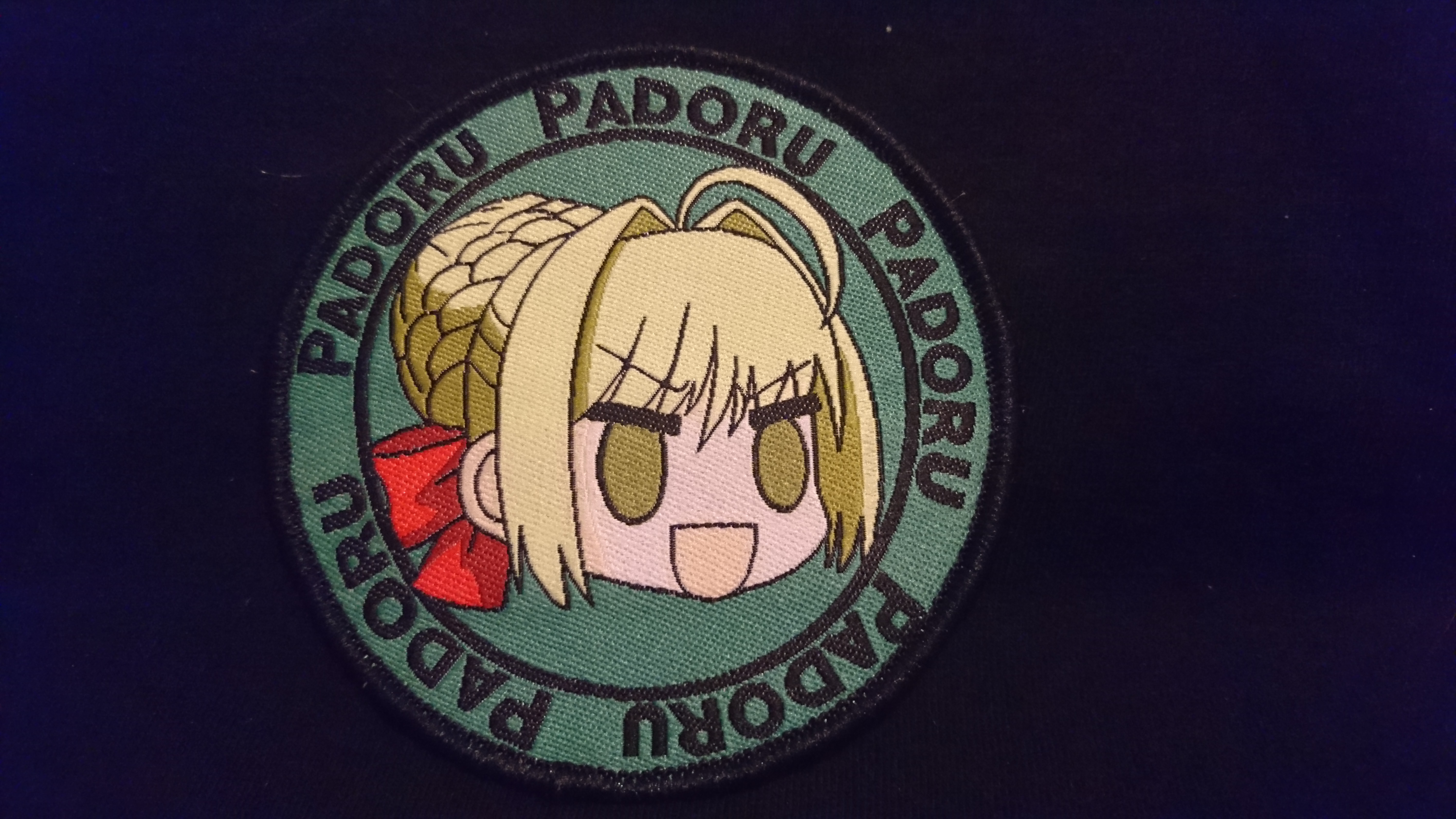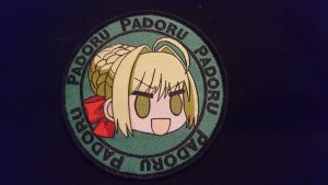 Here we have the third patch offered by my buddy Sourkraut, “Saber Padoru.” It’s a 3″ circular patch with velcro hook backing. It’s a fine woven patch with a merrowed border and the hook backing uses thread for solid attachment. This patch takes inspiration from the Fate Extra Omake where she flubs the words to “Jingle Bells.” Instead of “tadoru tadoru” which is “laughing all the way,” she says “padoru padoru” translated as “paddle paddle.” All she’s missing is her Santa’s hat but aside from that, it’s a perfect representation of the source material. You can’t go wrong with Sour’s artwork or his sense of humor.