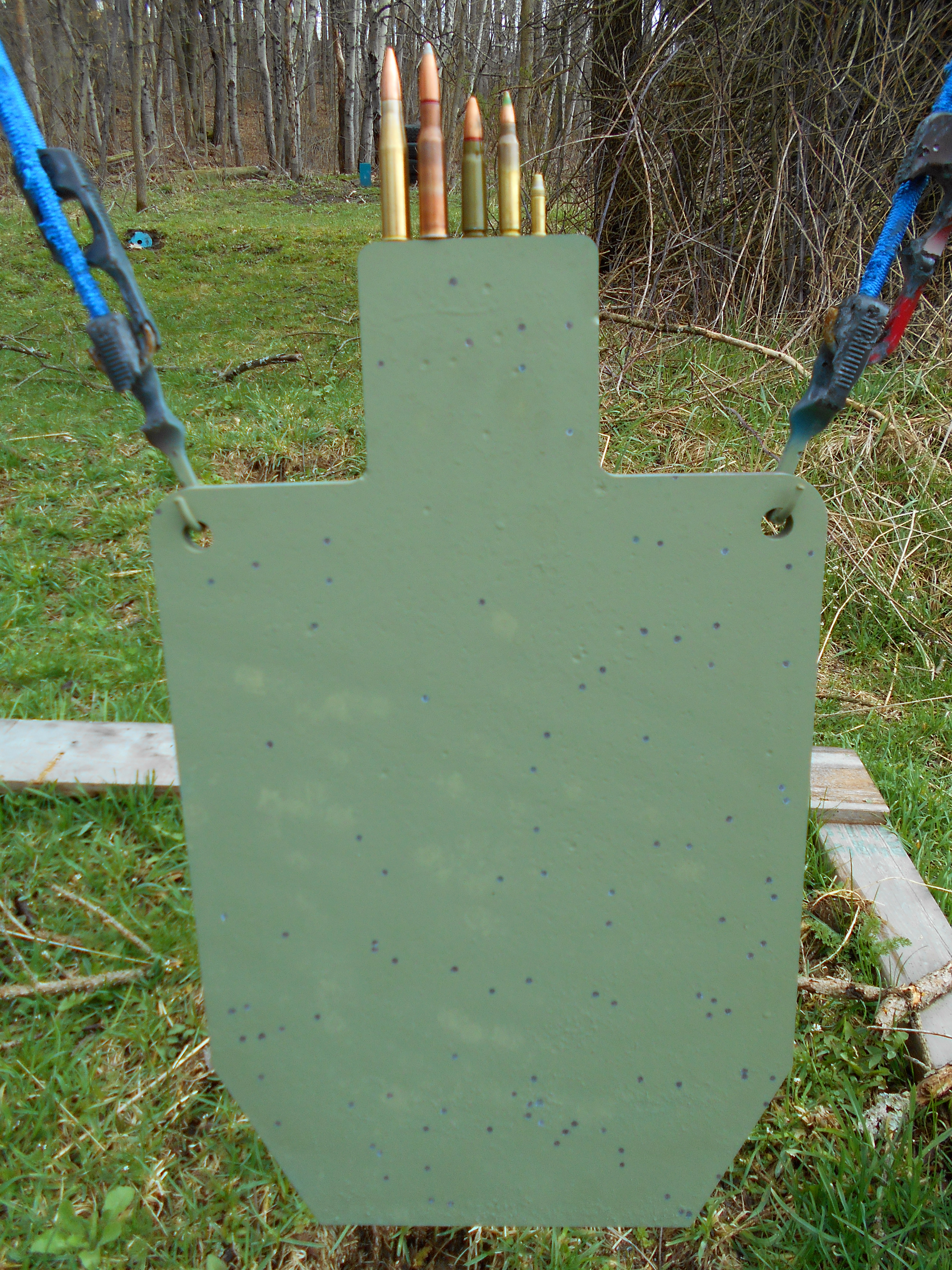 Pictured right is my steel target with cartridges placed atop of it to compare their physical size. The 8x56R is almost identical in length to the 7.62x54R. The safety of the gun is on the back of the bolt and on the left-hand side. The safety is pretty basic: flip-up the switch to turn the safety on, and flip it down to turn it off. The safety is also not a decocker, as the only way I have found to decock the gun is to pull the trigger, grab the bolt, and ride it home slowly. This can also be done in reverse to re-cock the bolt into a firing position. (Picture below in the next section gives visual aid along with the video above.)