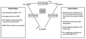 Bearing OCOKA in mind, lets say you find the perfect spot for your mission. Now you need to set up your “unit” to be effective for the particular mission, be it conducting observation operations or just bedding down for the night as part of a long range patrol. The most common method to defend an area is done through a patrol base. A patrol base is set up hastily most of the time, is done temporarily, and is relatively simple to set up so long as OCOKA is considered.