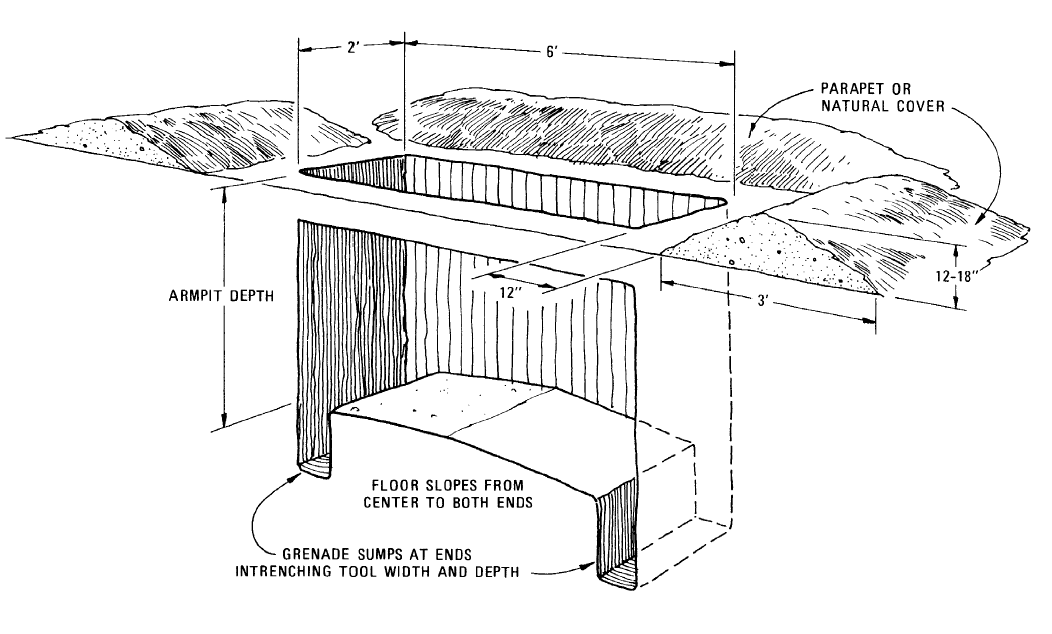 Finally, we need to cover developing a defensive position that will be in use for extended amounts of time. Lets say the patrol base needs to be made into a FOB. Guess what: you better get digging. Defensive preparations need to bear in mind that they need to offer protection from not only direct and indirect weapons, but aerial platforms and mitigate any openings a raid party can sneak in through. By digging a hole about as deep as the average M4 (or AR15 for you civilian plebs), and about 7 feet long, you enable a pretty decent fighting position where you can sleep and store your gear. Supplement that with sandbag emplacements around it, and you might even have enough room to sit up for a bit. Make sure to slope the immediate front of your hole so as to have a grenade sump and mitigate any incoming frags from rolling into your hole. Following basic foxholes, build overhead cover using sandbags and logs, so as to protect from airburst munitions and shrapnel. Set up claymores ahead of your position far enough so you don’t get any shrapnel but close enough you can observe them. Build ditches around the area and set up concertina wire in the ditch so as to stop vehicles from trying to enter and preventing enemy infantry from using the ditch for cover.
